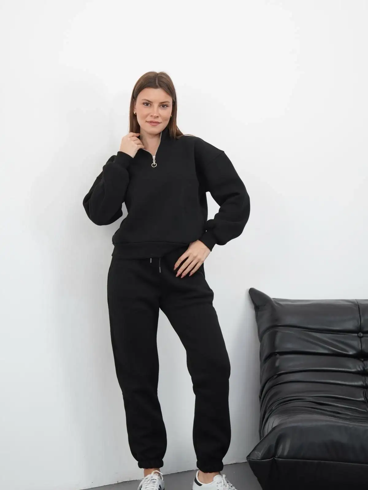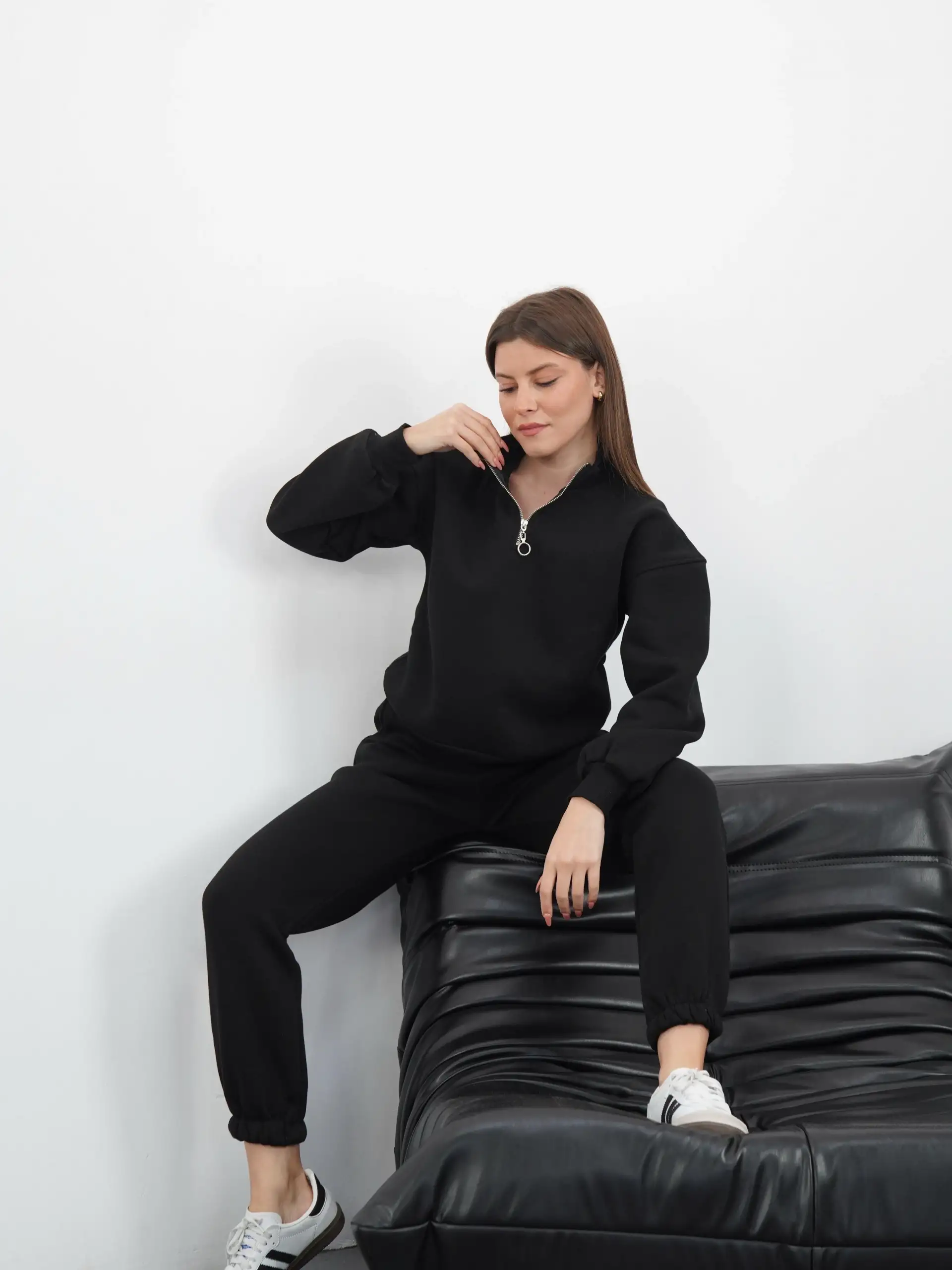 Şık ve modern bir görünüm elde etmek isteyen kadınlar için ideal olan şardonlu yarım fermuarlı alt üst takım siyah, gardırobunuzun vazgeçilmez parçalarından biri olmaya aday. Hem günlük hayatta hem de özel davetlerde rahatlıkla tercih edebileceğiniz bu takım, hem şıklığı hem de konforu bir arada sunuyor.