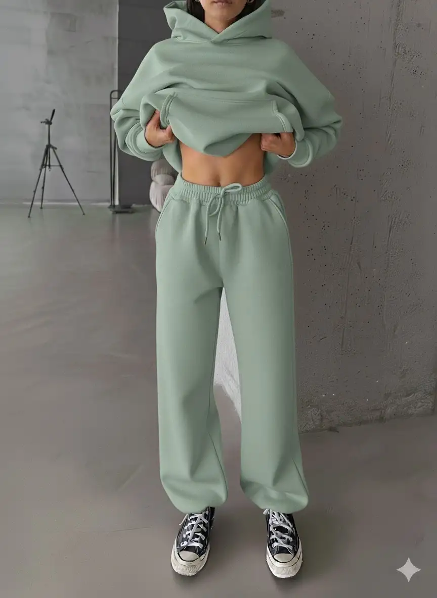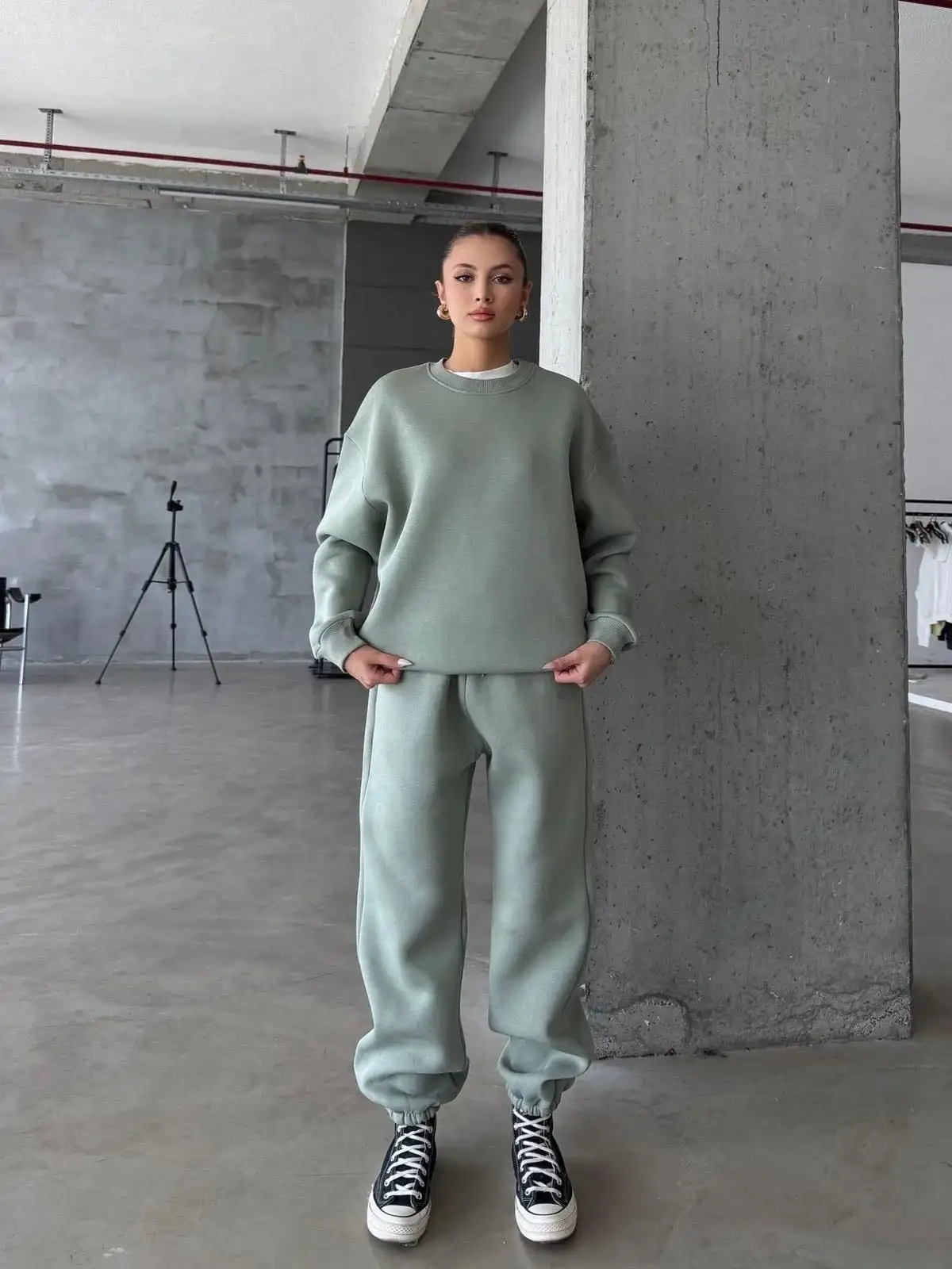 Eşofmanın mint rengi, enerjik ve fresh bir görünüm sağlarken, şardon detayı da şık bir dokunuş katıyor.