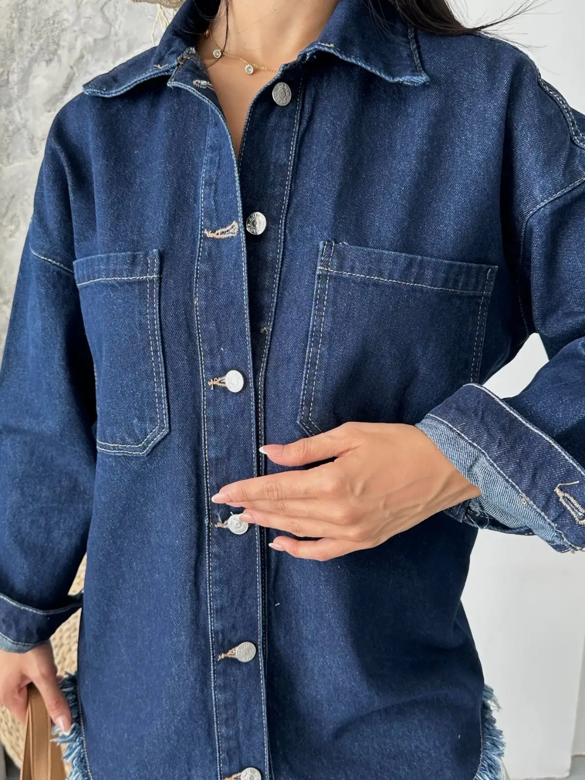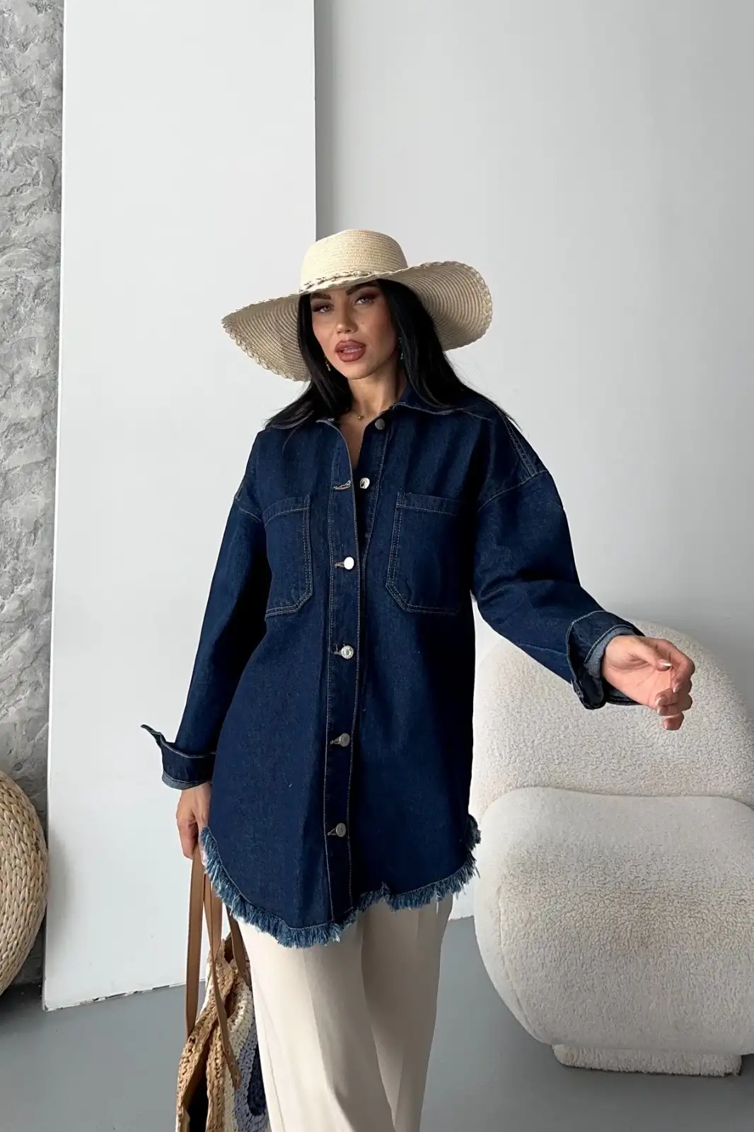 Cepli püsküllü kar yıkama kot ceket koyu mavi d2515