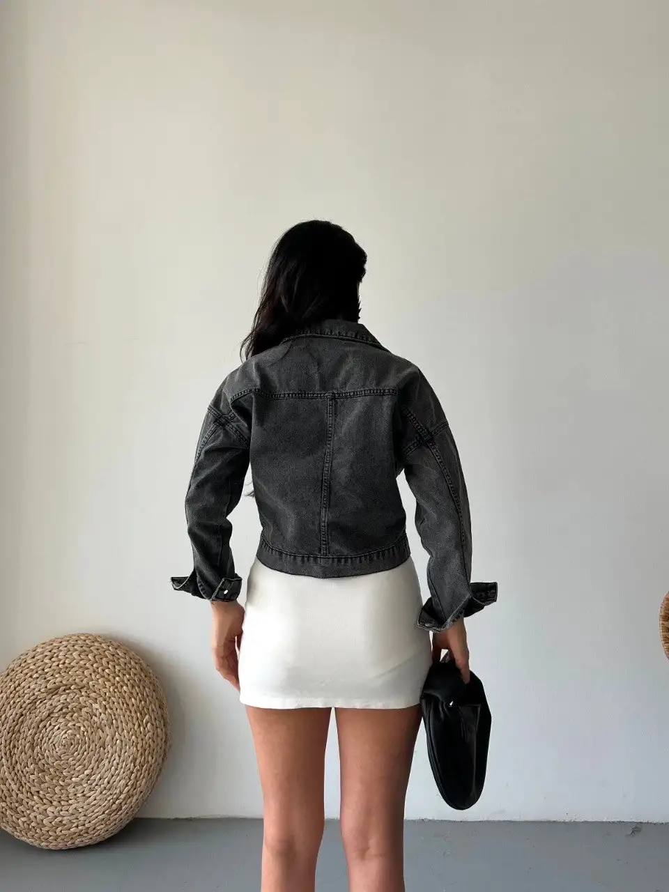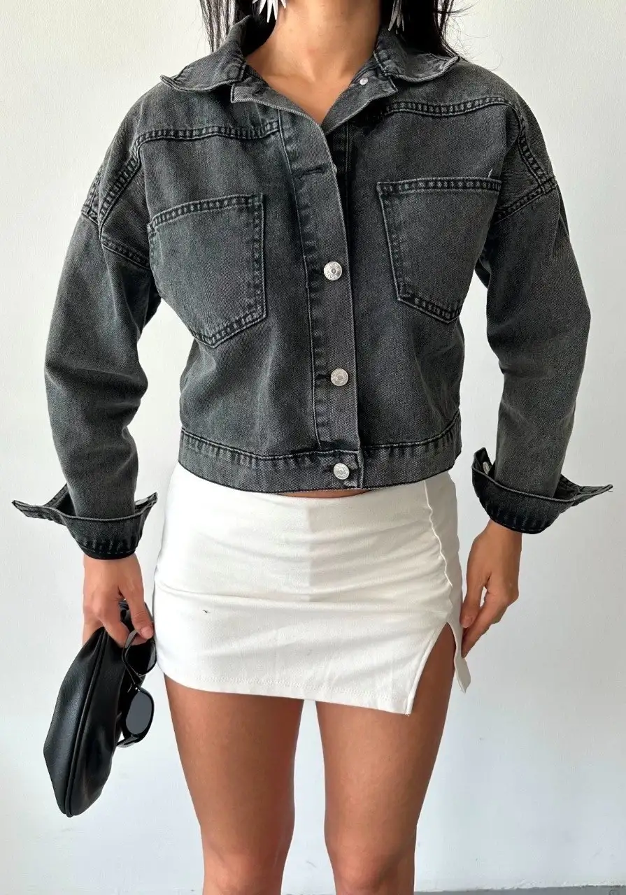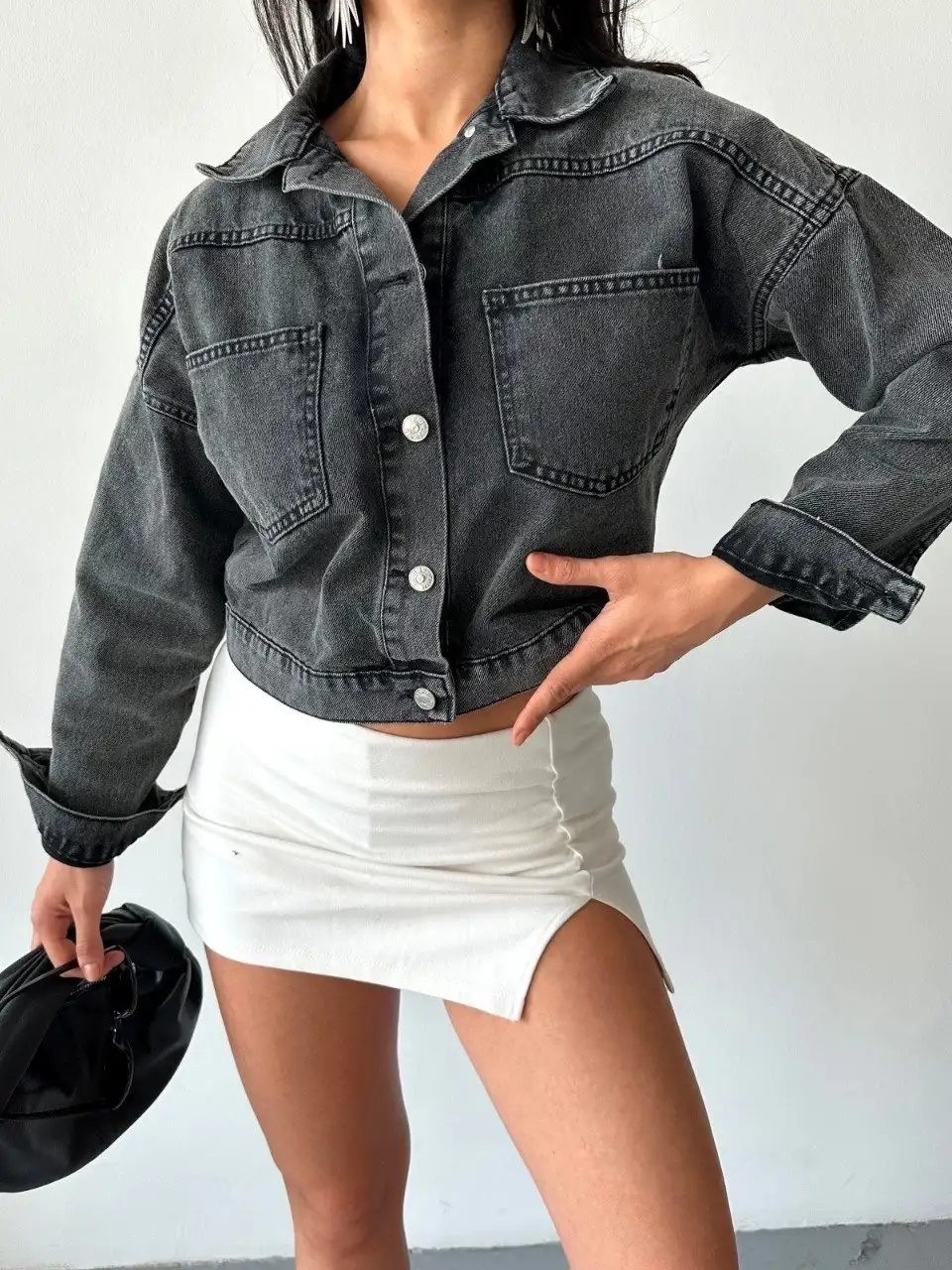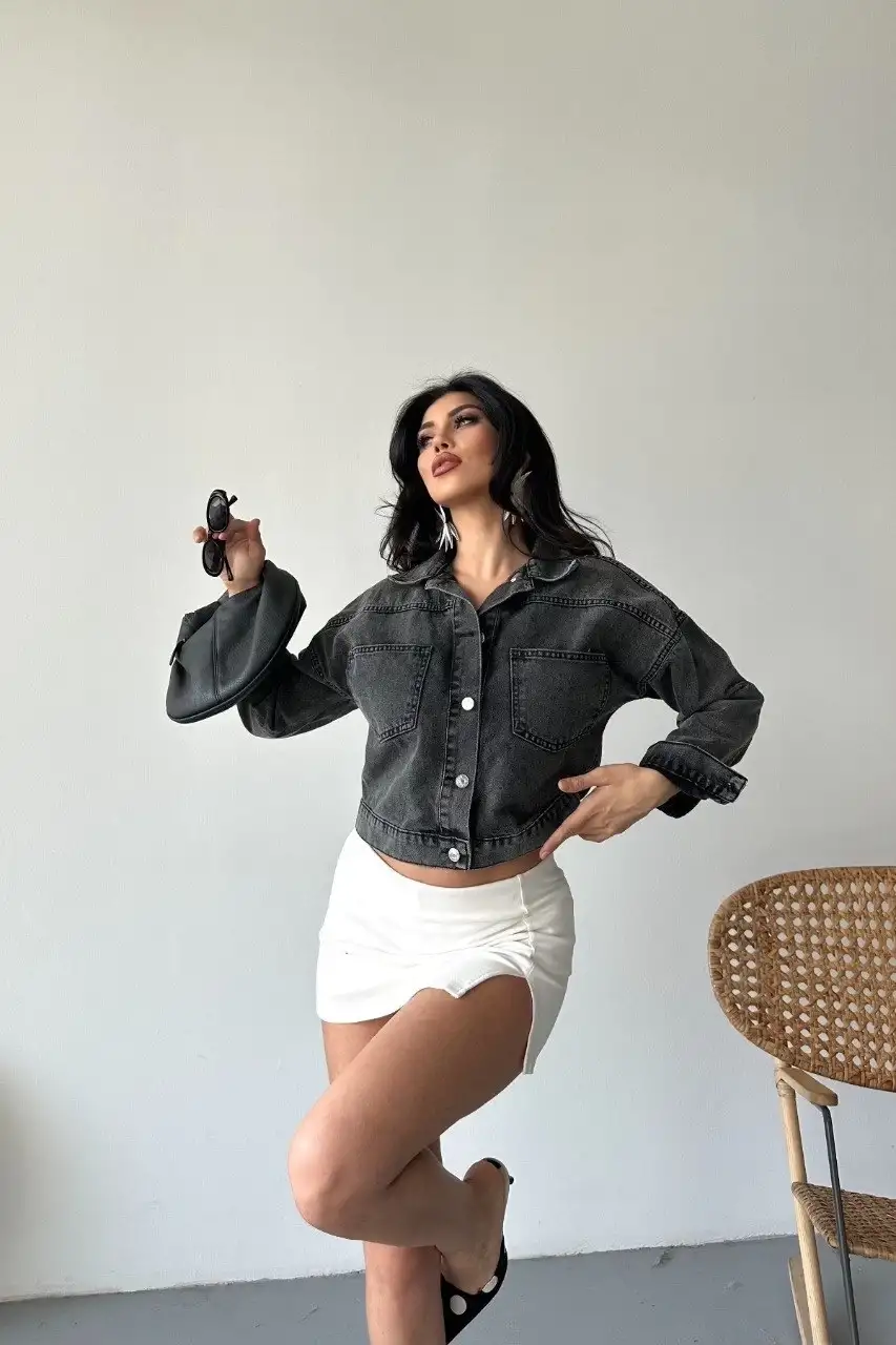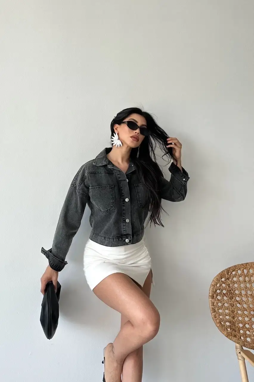 Çift cepli kol katlamalı süper taş enzim yıkama crop kot ceket füme d2000