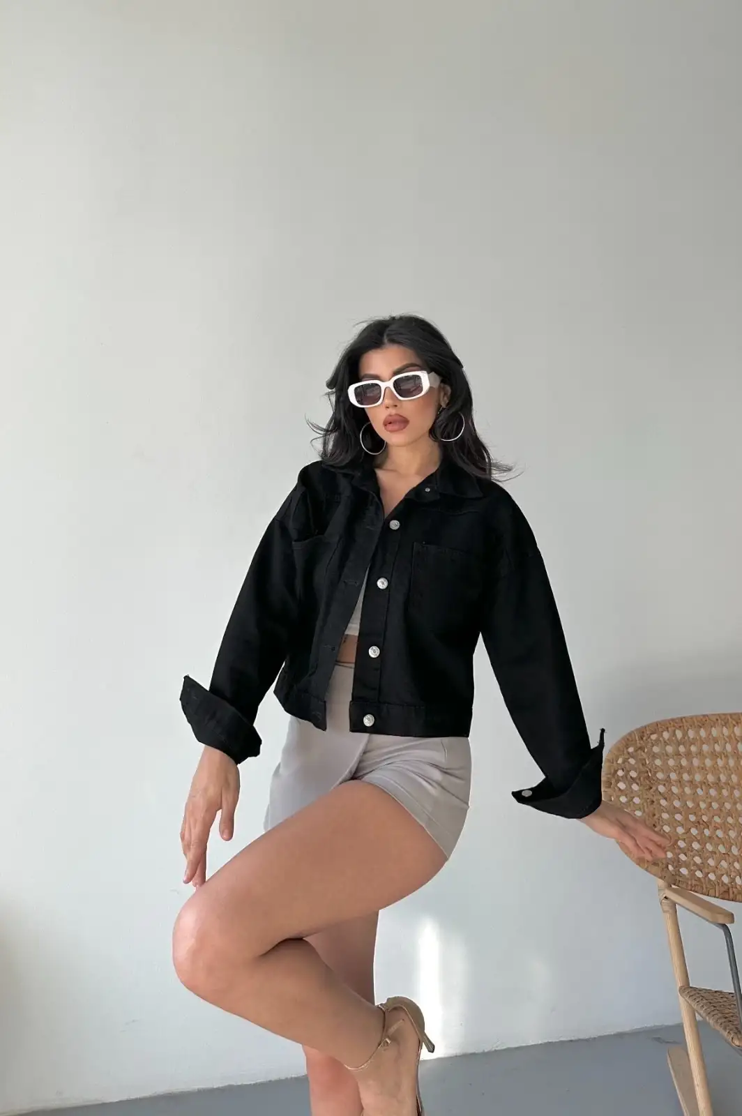 Çift cepli kol katlamalı süper taş enzim yıkamalı crop kot ceket siyah d2000