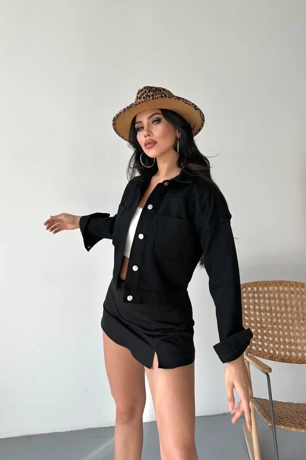 D2000 markalı çift cepli süper taş enzim yıkama crop ceket siyah, gardırobunuzun vazgeçilmezi olmaya aday!