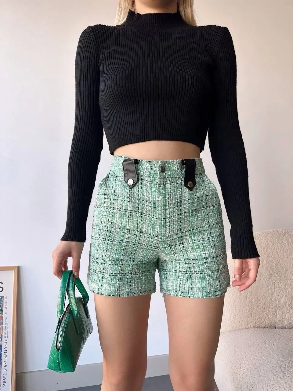 Çıtçıtlı siyah köprü tüvit şort yeşil