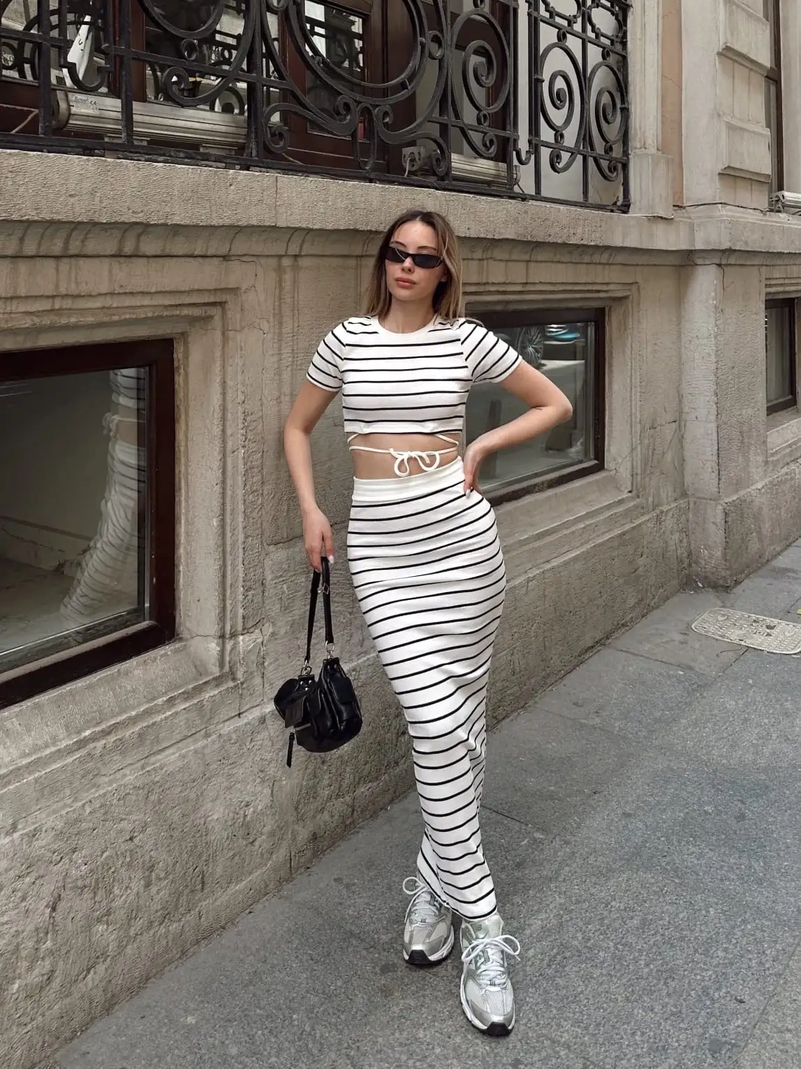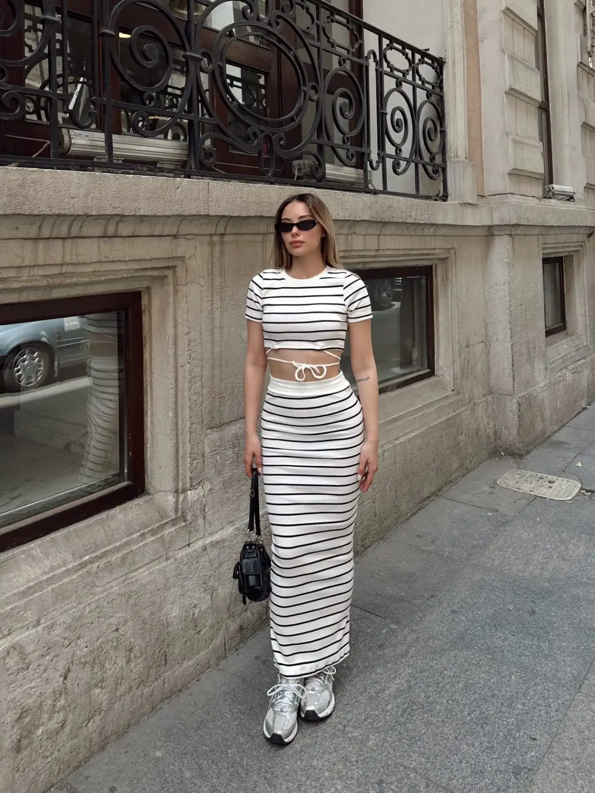 Beyaz S3609 çizgili etekli takım, şıklığı ve zarifliği bir arada sunar.