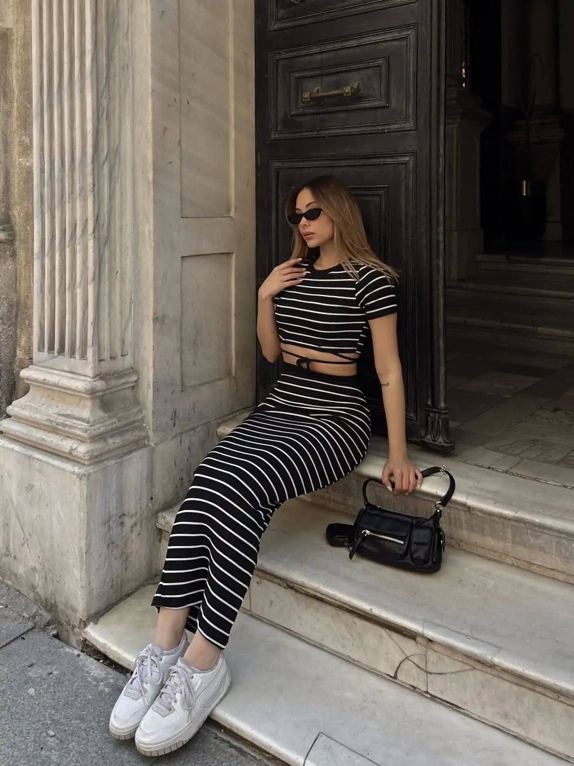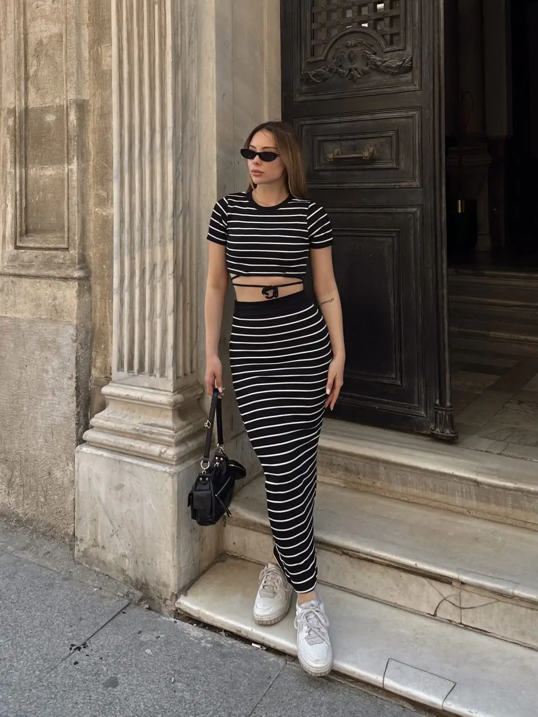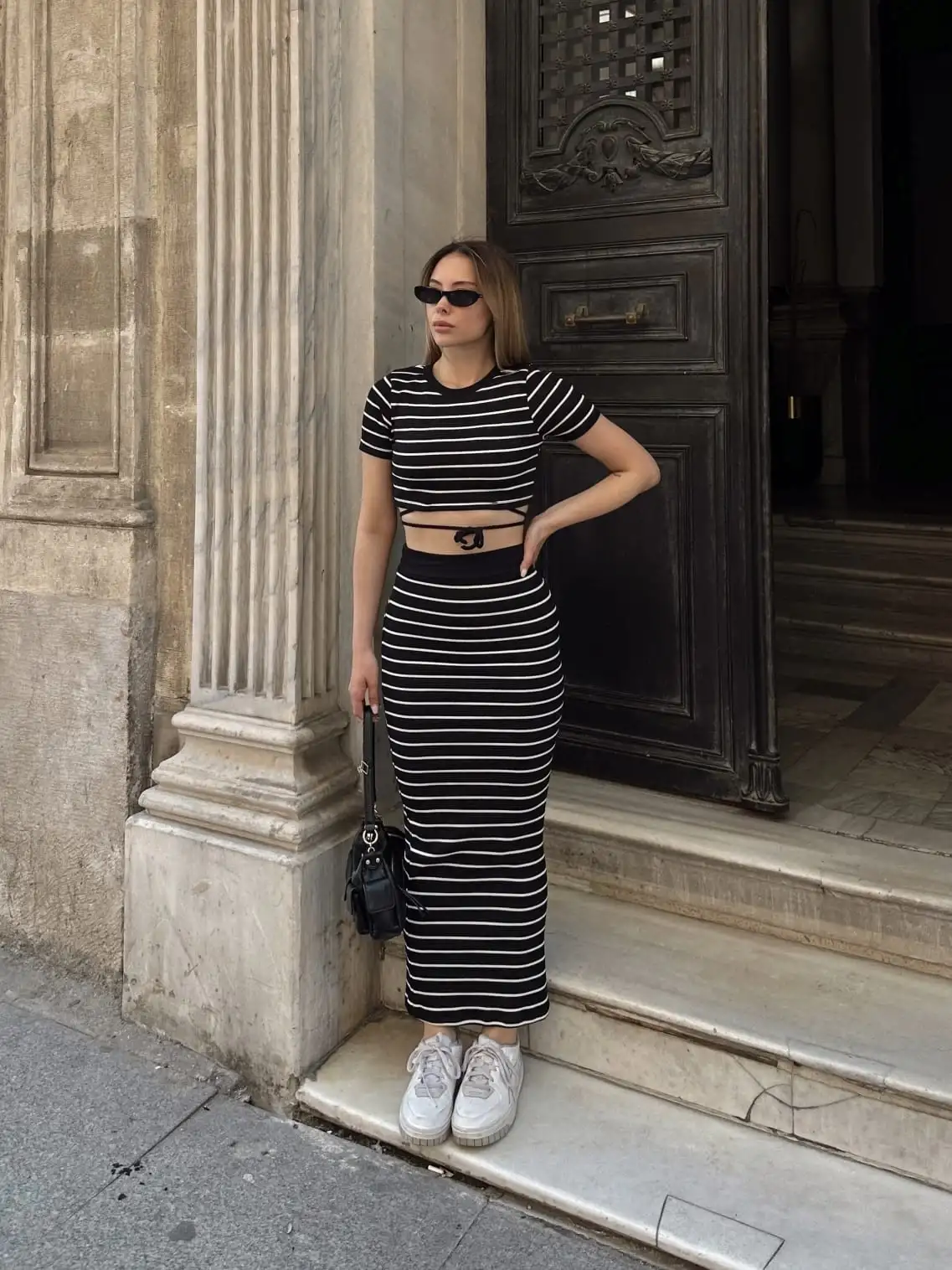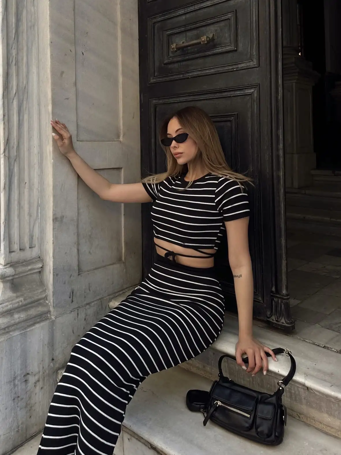 Bu siyah çizgili etekli takım, şıklık ve rahatlığı bir arada sunuyor. Hem günlük kullanıma hem de özel davetlere uygun olan bu takım, gardırobunuzun vazgeçilmezi olmaya aday.