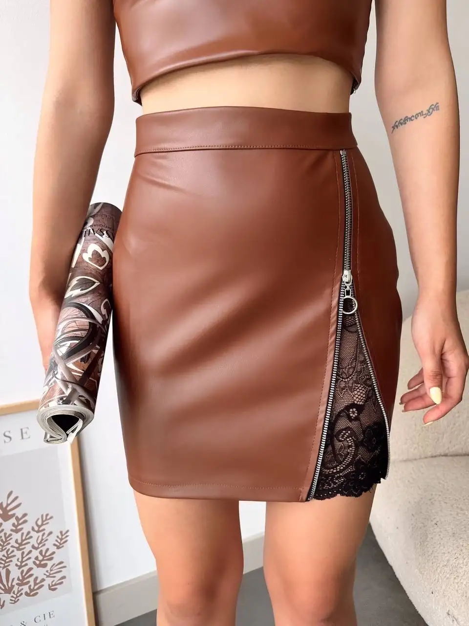Dantelli fermuarlı deri etek kahve w24598