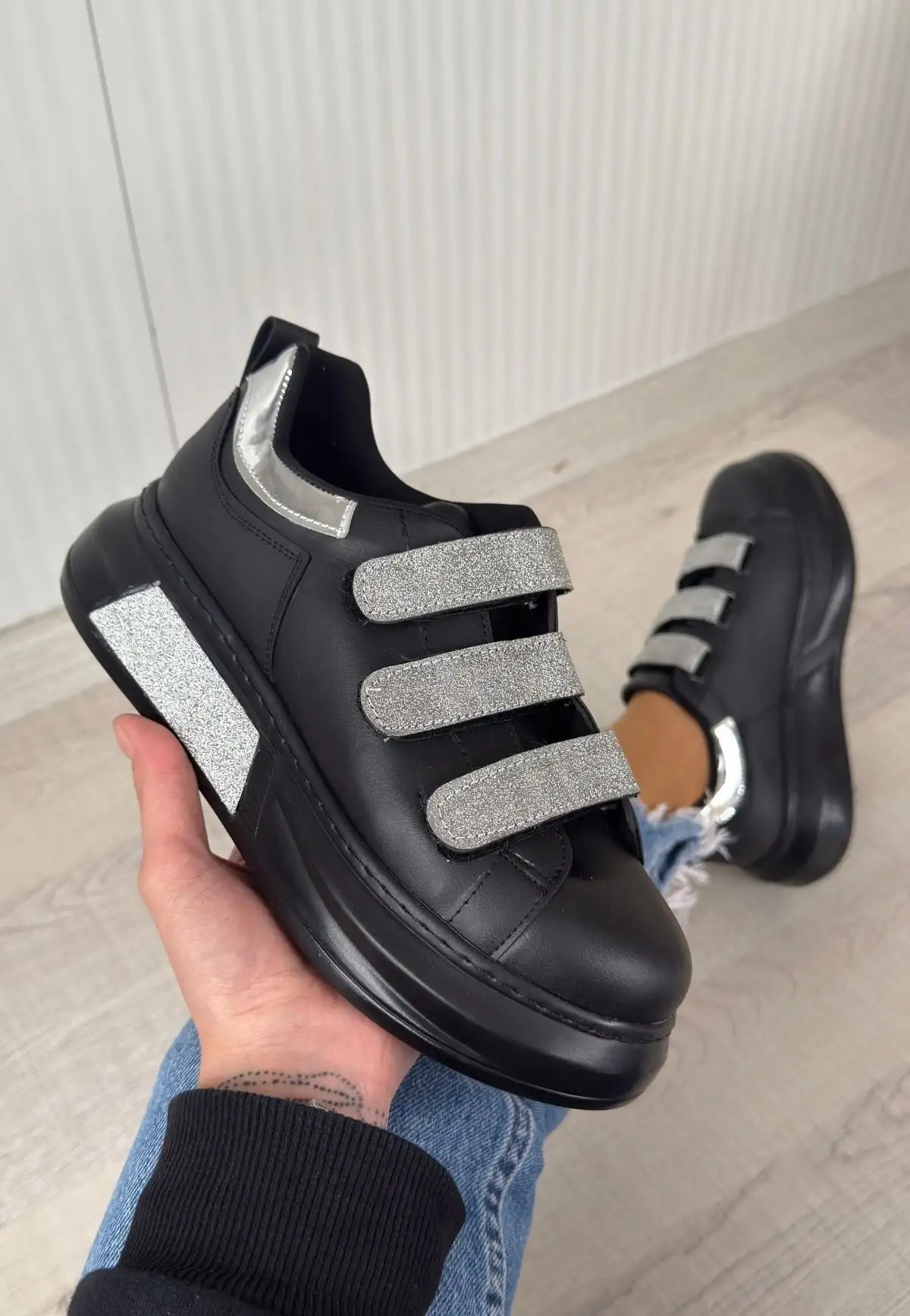 Elika Siyah Cilt Simli Cırt Cırtlı Spor Ayakkabı