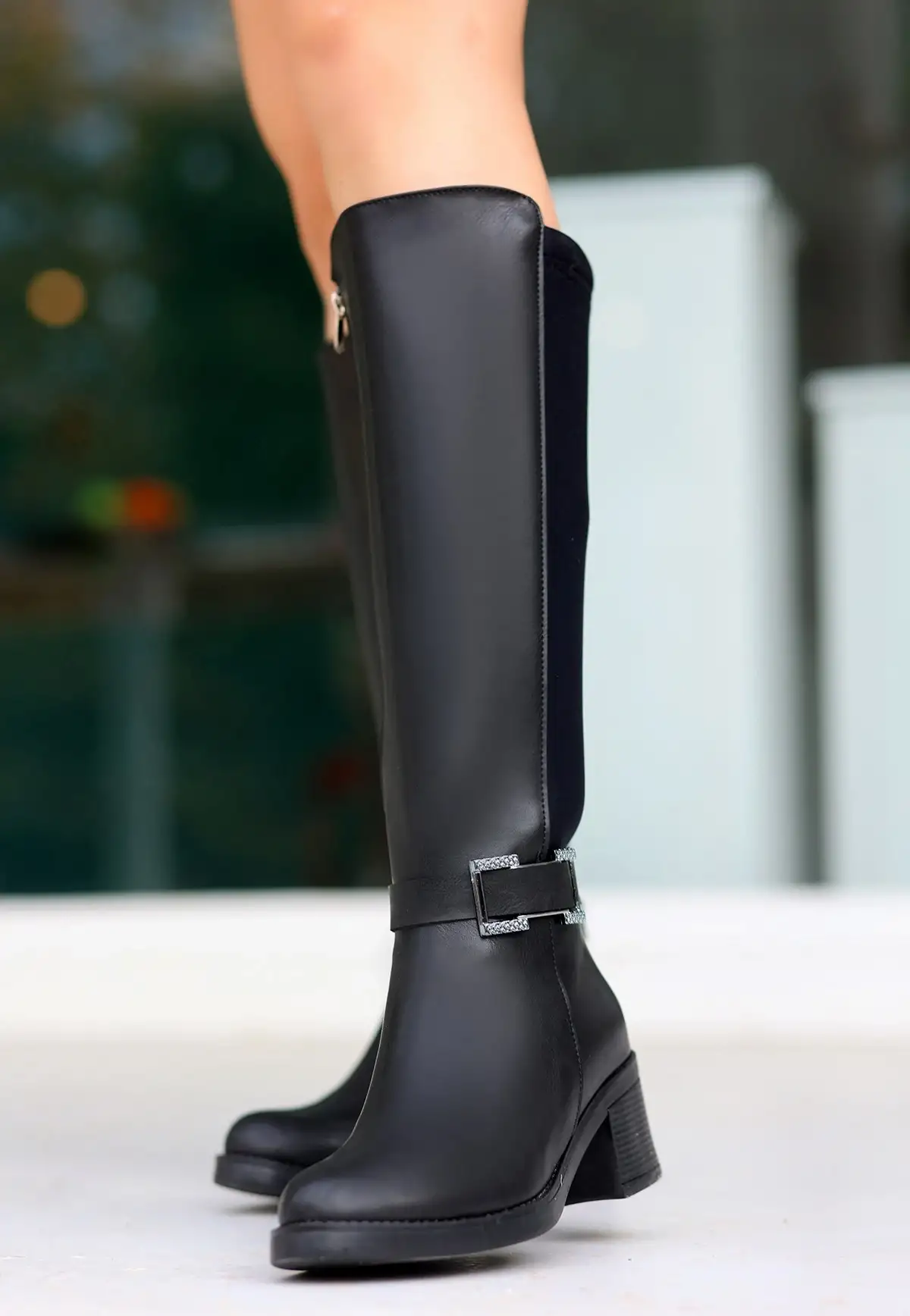 Detay: Topuklu Yandan Fermuarlı Arka Kısmı Streç Diz Altı Çizme