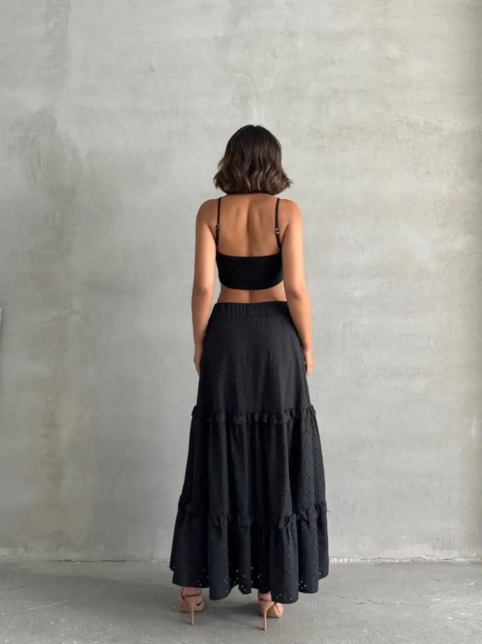 Fırfırlı brodeli astarlı uzun etek siyah s255047