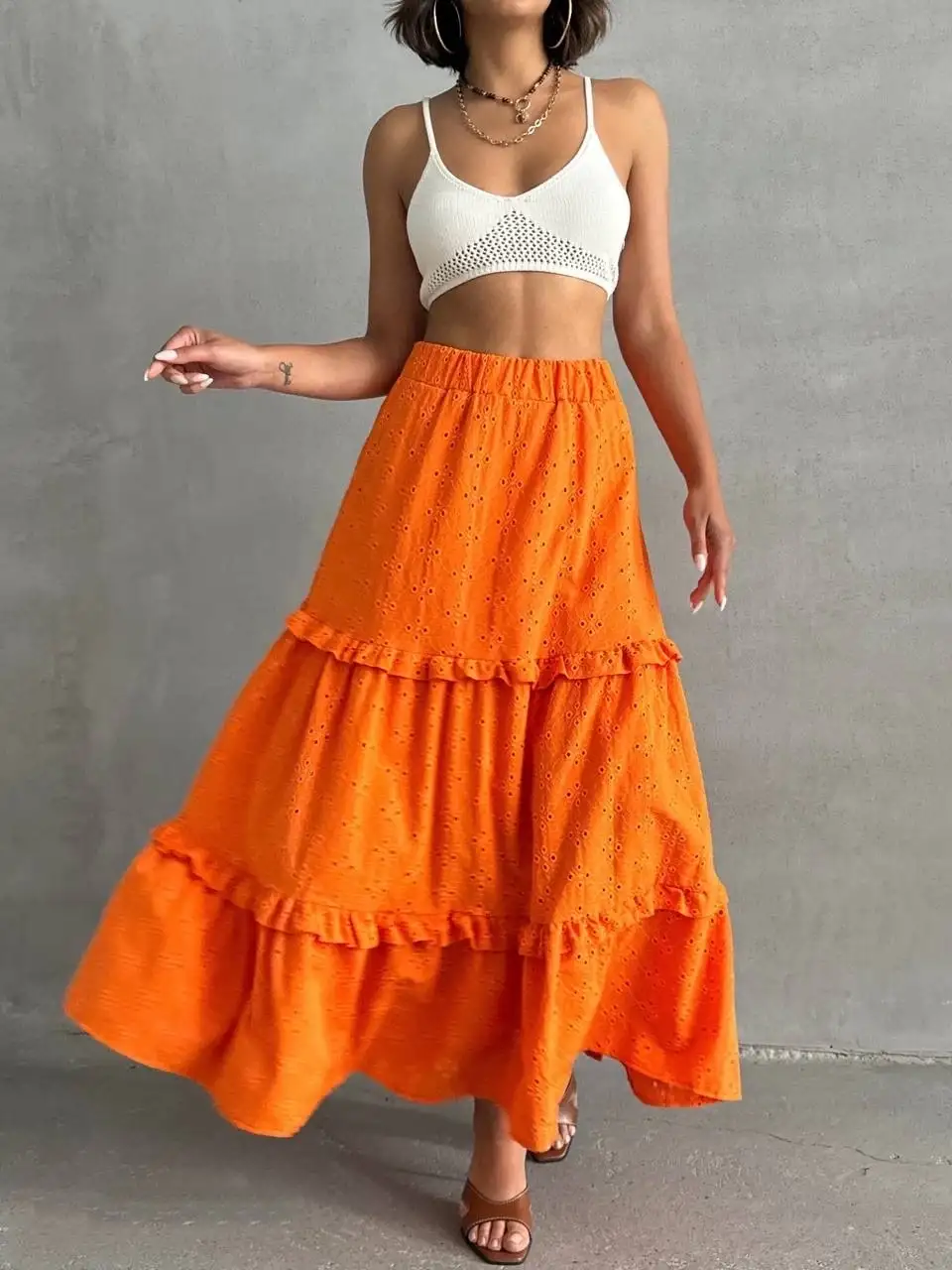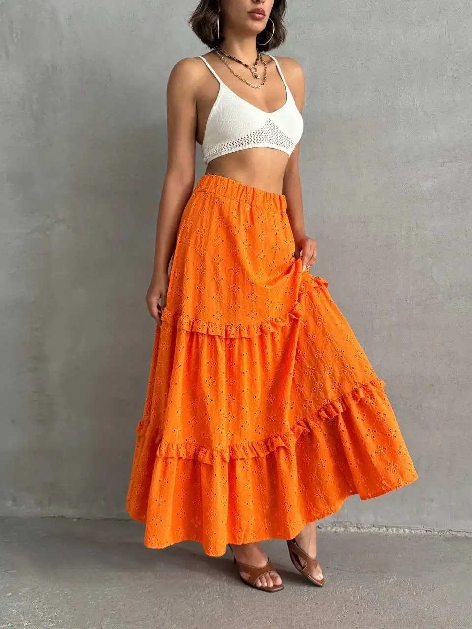 Şıklığı ve rahatlığı bir arada sunan Fırfırlı Brodeli Astarlı Uzun Etek, gardırobunuzun vazgeçilmezi olmaya aday!
