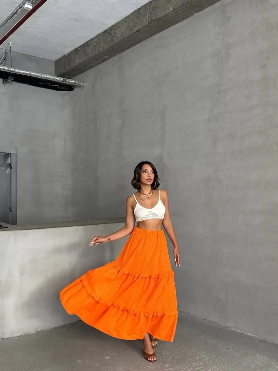 - Turuncu rengiyle dikkat çeken etek, her mevsimde kullanım imkanı sunar.