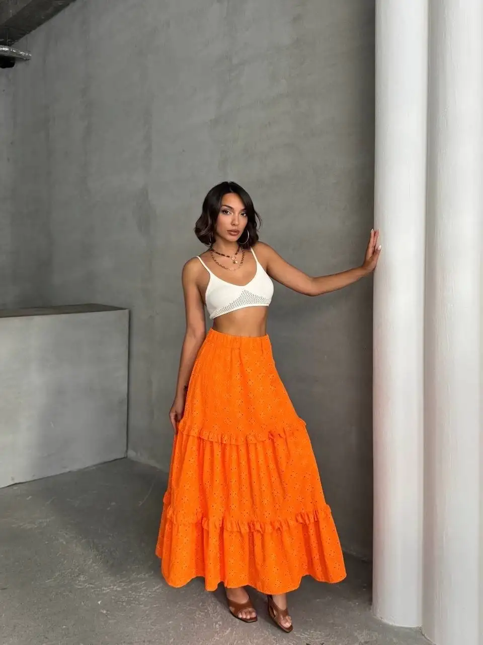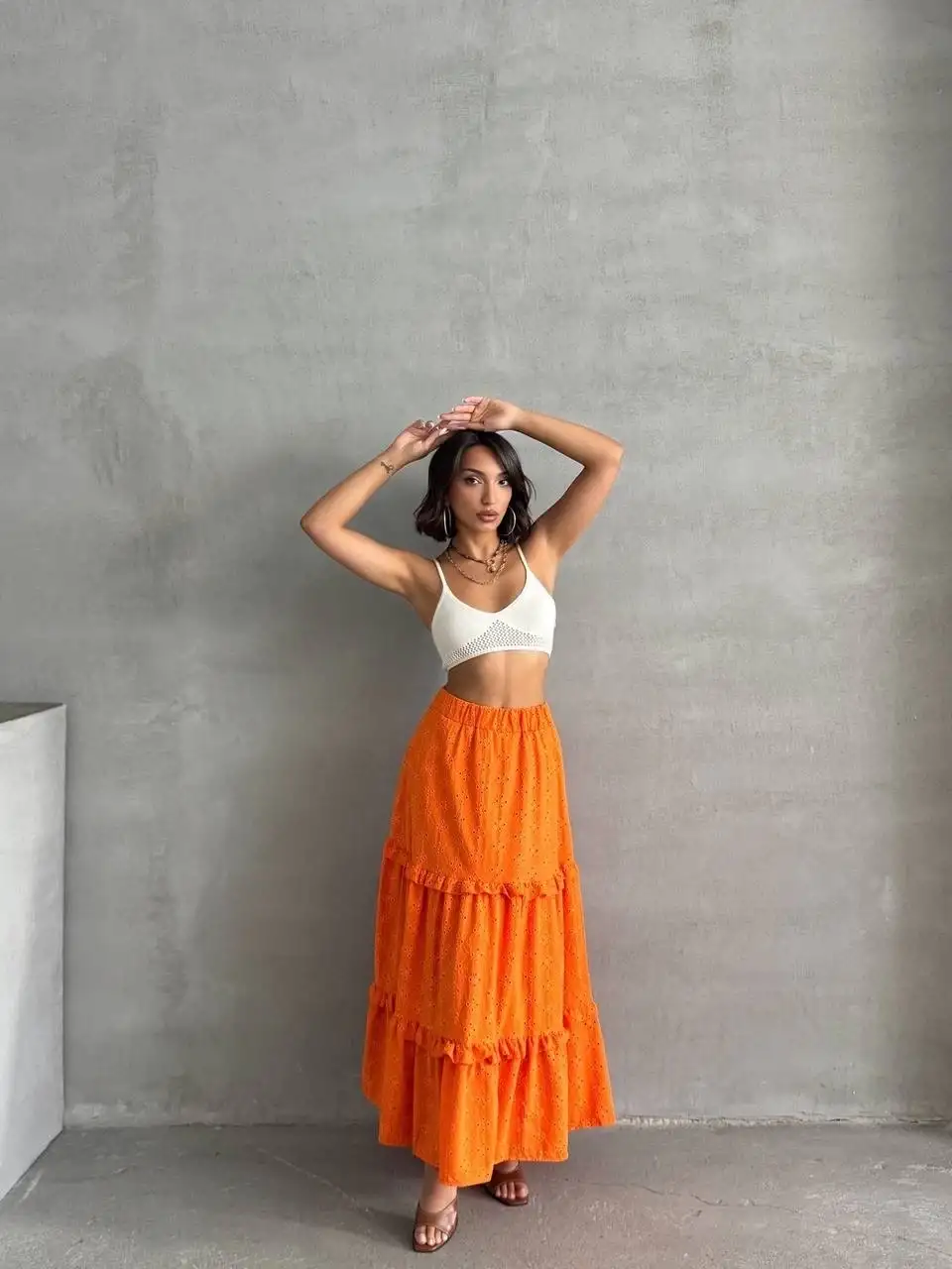 Fırfırlı brodeli astarlı uzun etek turuncu s255047