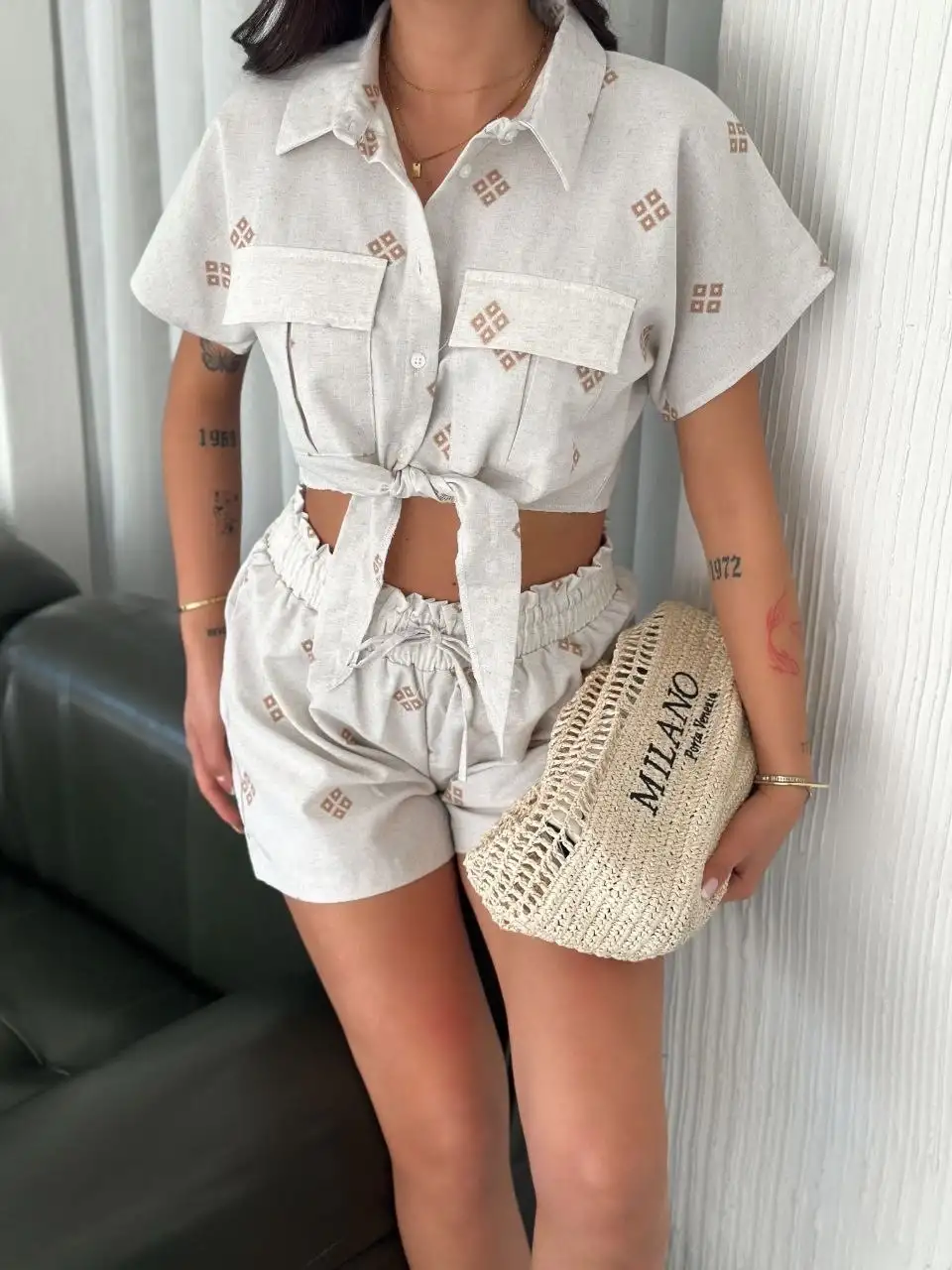 Keten kumaştan üretilen şık bir görünüme sahip gömlek şort takımı ile her zaman şıklığınızı koruyun.