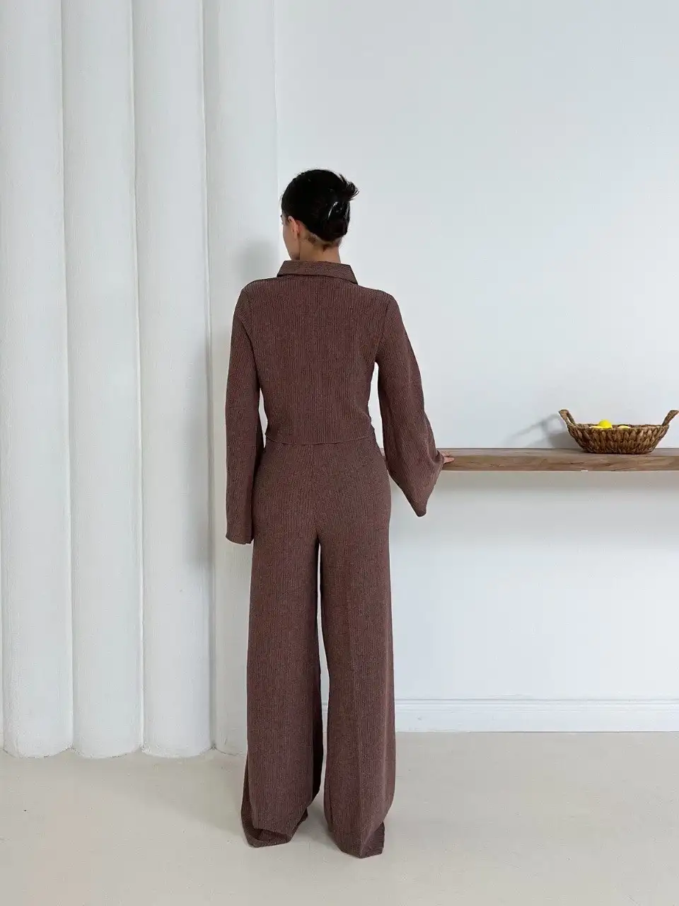 Gömlek yaka kaplama düğmeli takım kahve st265866