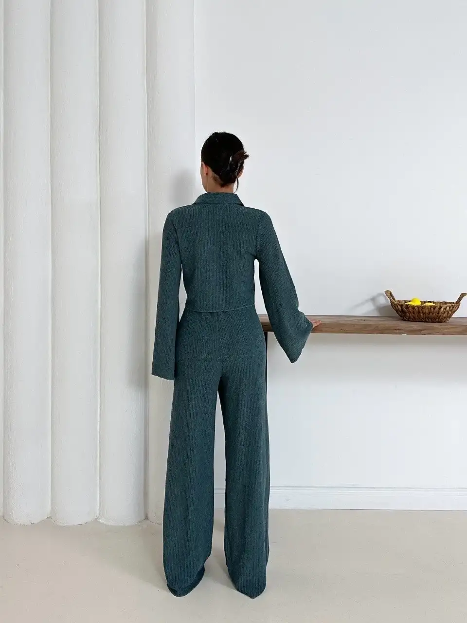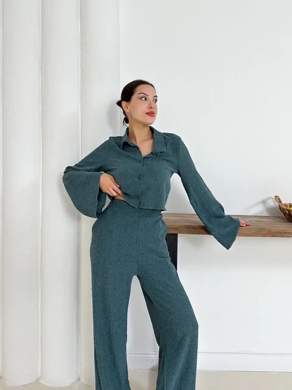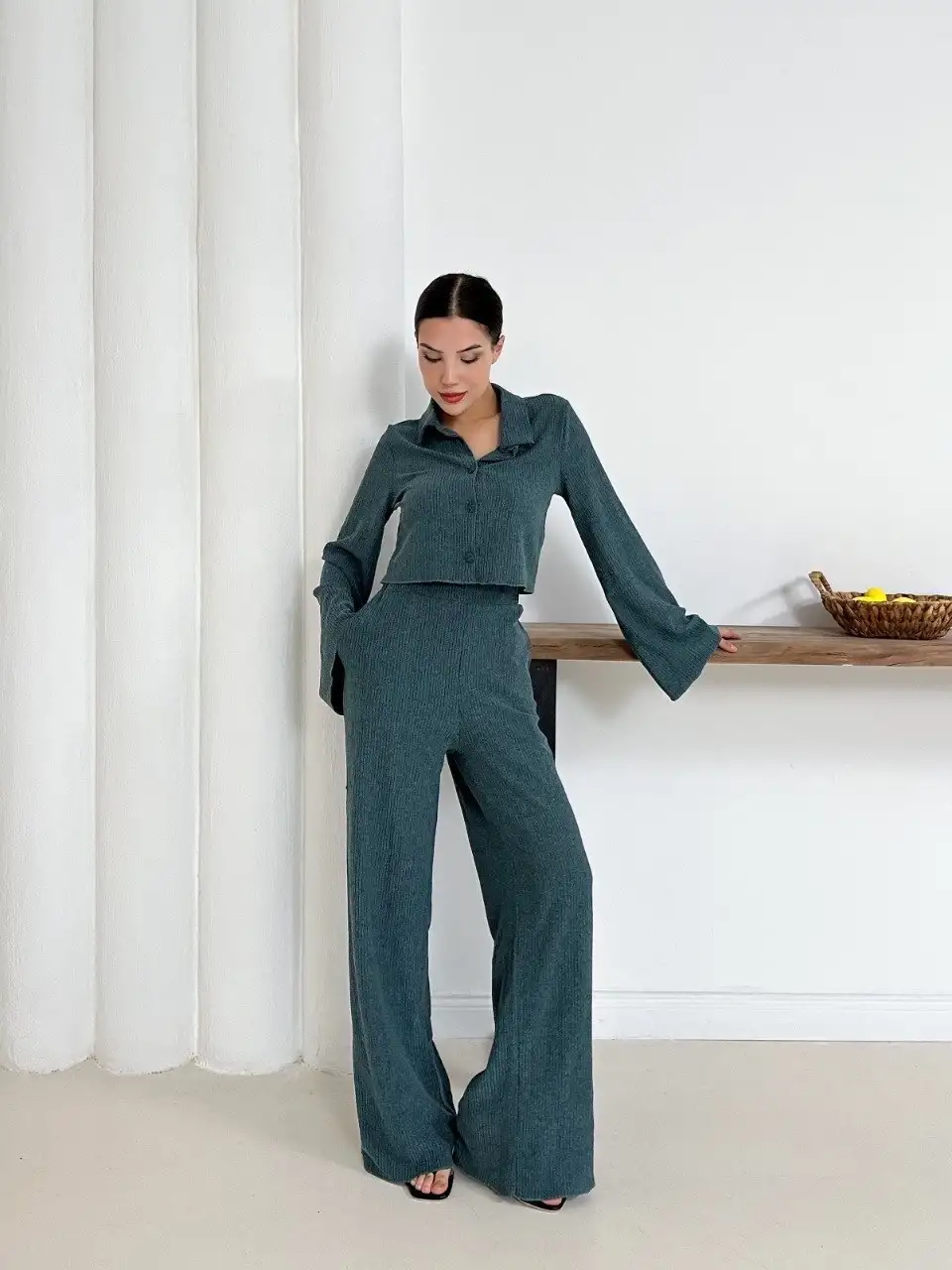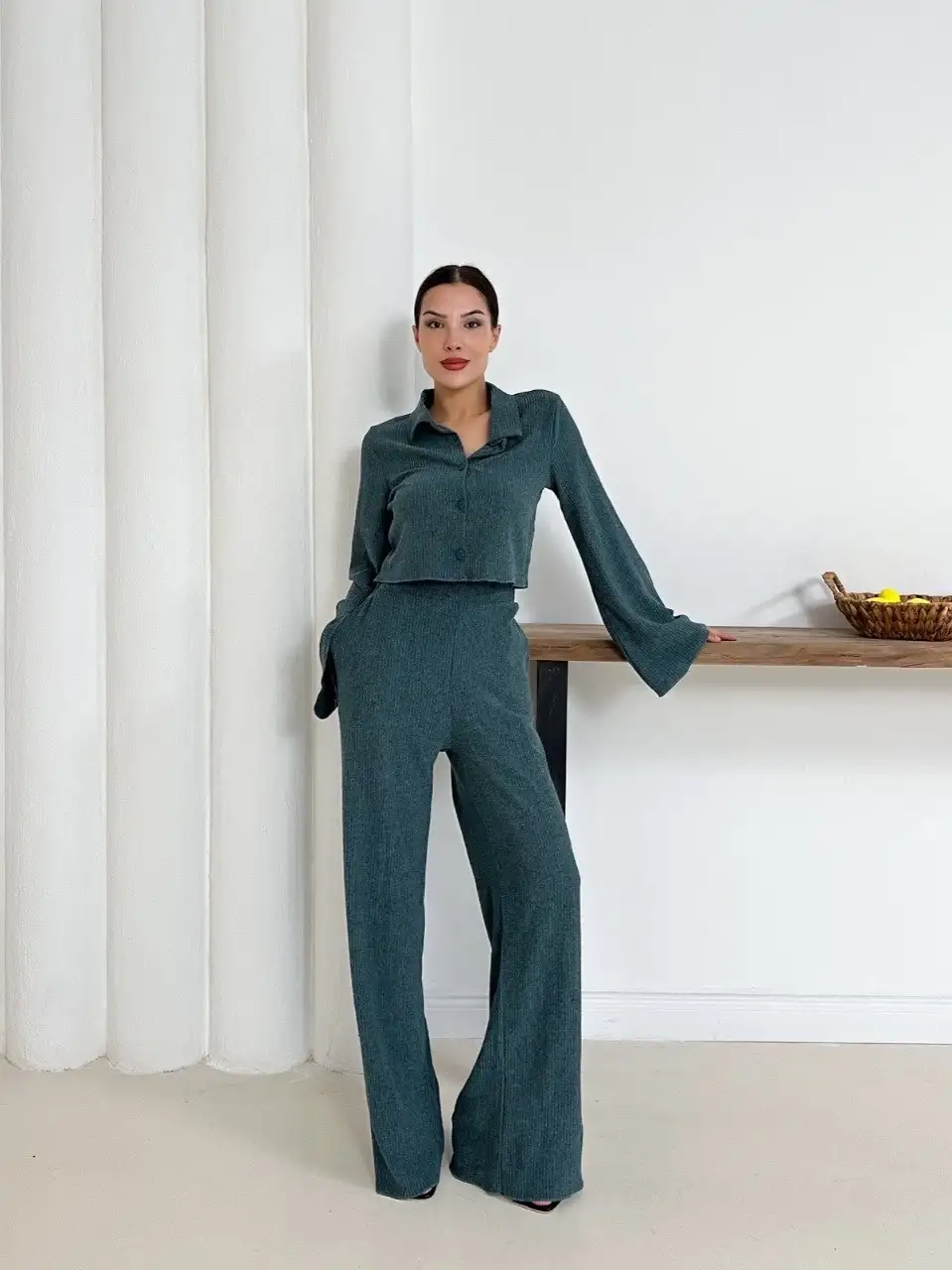 Gömlek yaka kaplama düğmeli takım petrol yeşili st265866