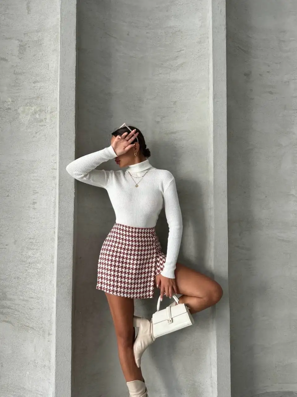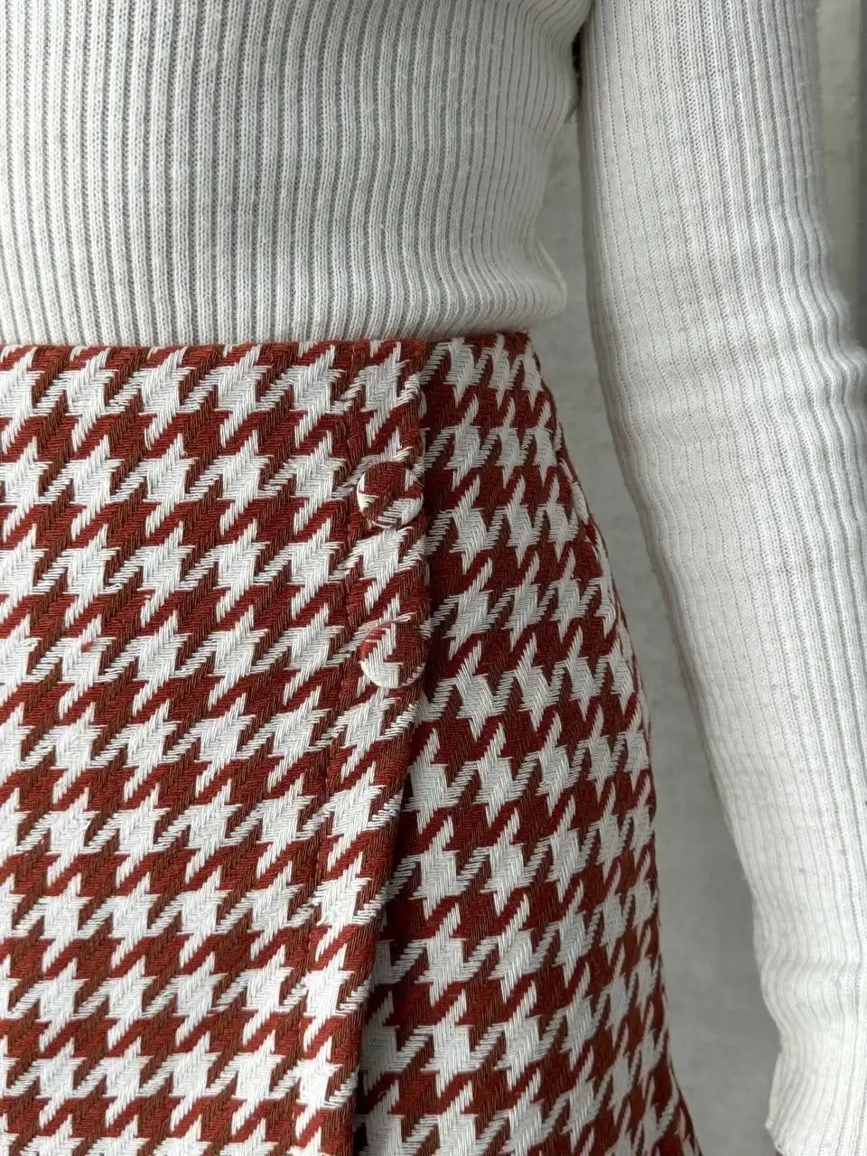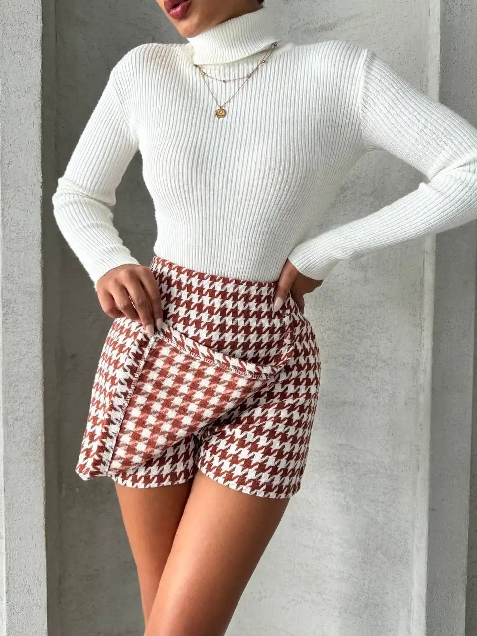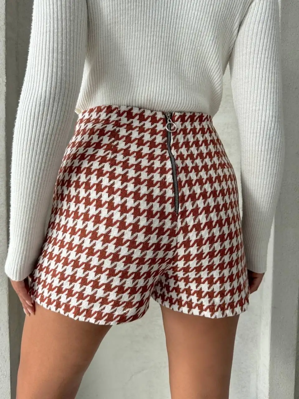 İki düğmeli kaz ayağı desen ch kumaş şort etek bordobeyaz h26414