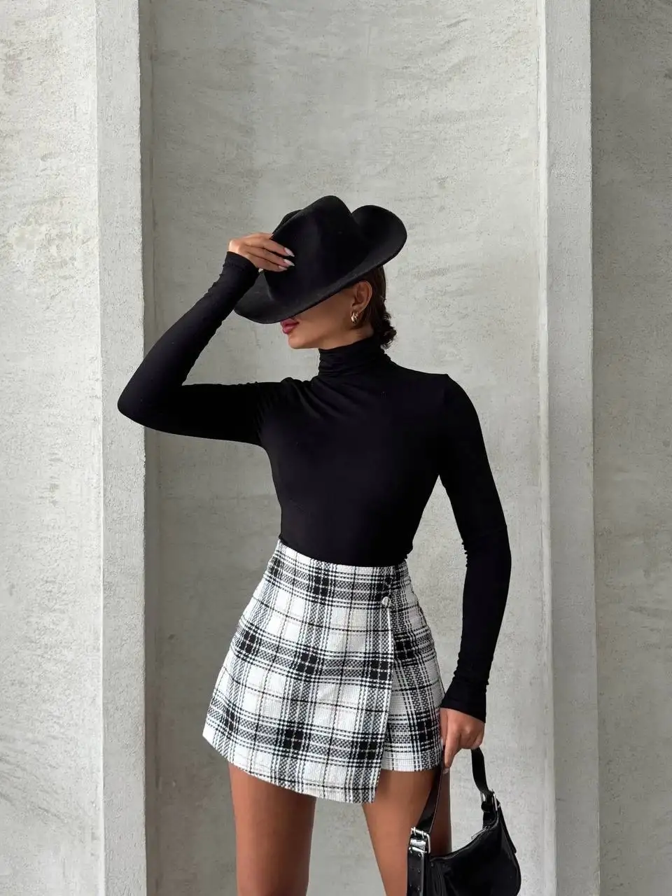 İki düğmeli şort ch kumaş etek ekoseli siyahbeyaz h26414