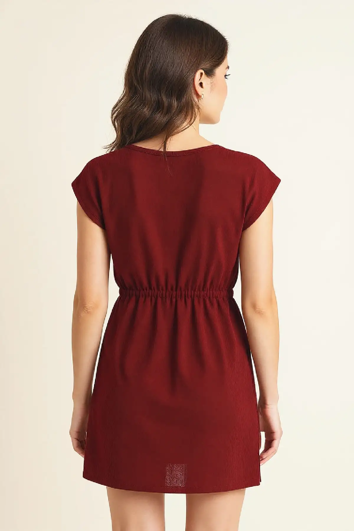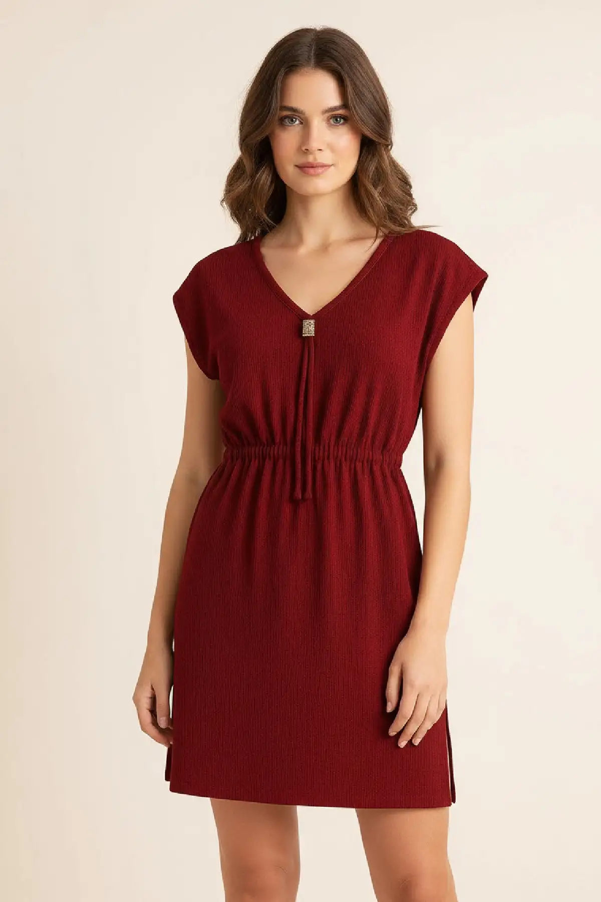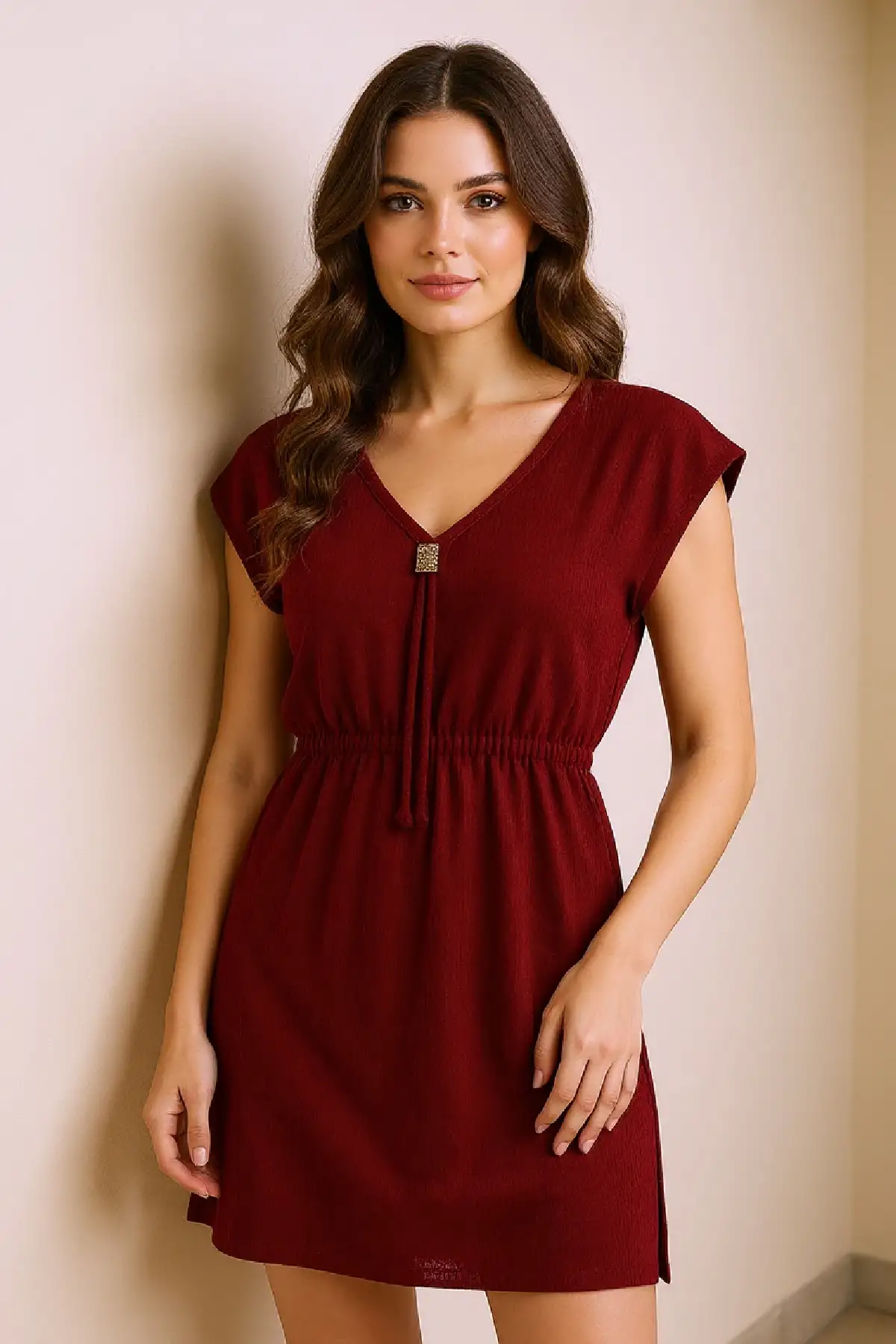 Kadın Bordo Yanları Yırtmaçlı Tokalı V Yaka Mini Plaj Elbisesi, sezonun en çarpıcı tonlarından biriyle karşınızda.V yaka kesimiyle zarif bir görünüm sunarken, beldeki tokasıyla vücut hatlarını zarifçe vurgular.Yanlarında yer alan yırtmaç detayları sayesinde yürüyüşlerde rahatlık sağlar ve feminen bir duruş kazandırır.Dokulu yumuşak kumaşı hem nefes alır hem de gün boyu konfor sağlar.Güneşli günlerde sahil yürüyüşlerinden yaz akşamı davetlerine kadar her ortamda tarzınızı yansıtmak için idealdir.Bordo rengin sofistike havası ten renginizi ön plana çıkarır, sade aksesuarlarla birleştiğinde zarif bir görünüm oluşturur.Öne çıkan özellikler:Şık V yaka ve tokalı bel detayıYan yırtmaçlar ile konforlu kullanımHafif, nefes alabilen kumaşYazlık, tatil ve günlük kombinler için uygunDökümlü mini boy modern kesim]]>