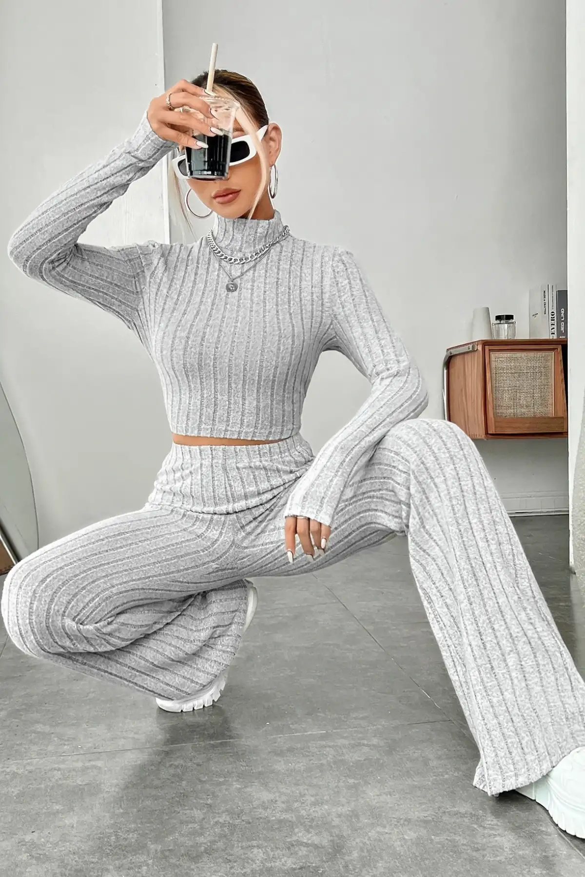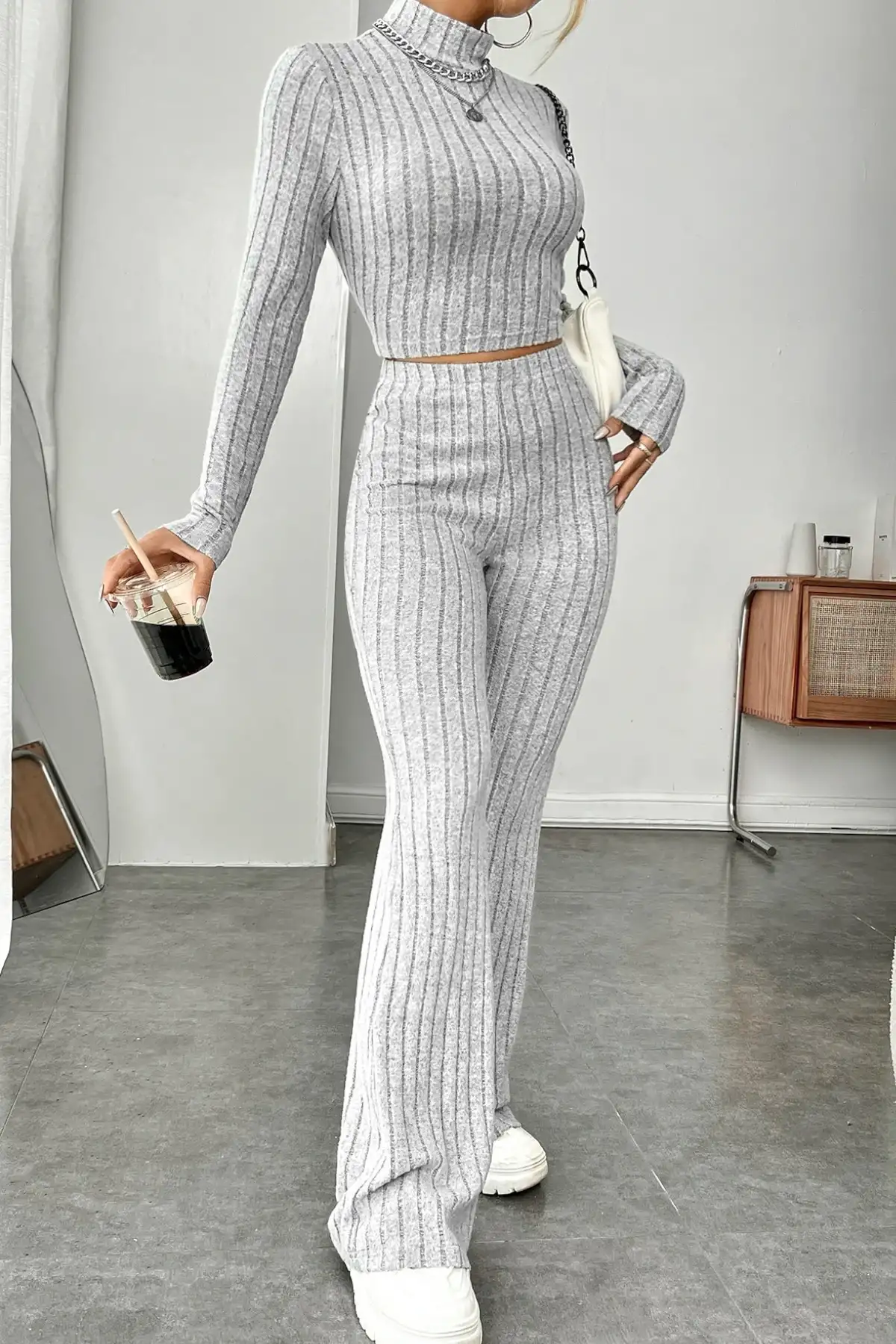 Trend olan açık gri kadın ikili takım, rahatlığı ve şıklığı bir arada sunarak gardırobunuzun en sevilen parçalarından biri olmaya aday.Özgün ve modern tasarımıyla dikkat çeken takım, şık dış görünüşüyle her ortamda kendinizi özel hissetmenizi sağlar.Öne Çıkan Özellikler:- Balıkçı yaka üst parçası ile modaya uygun bir görünüm.- Crop top tarzı üst sayesinde cesur ve çekici bir stil.- Yüksek bel pantolon, zarif bir siluet yaratır ve bacakları olduğundan daha uzun gösterir.- Hafif geniş paçalar sayesinde modern bir tarz yakalayın.- Yumuşak ve esnek kumaş dokusu, gün boyu konfor sağlar.Kullanım Alanları:- Evde rahatça giyilebilecek konforlu bir seçenek.- Günlük hayatın her anında kullanılabilecek şık ve zarif bir kombindir.- Beyaz spor ayakkabılar ve çantalarla tamamlanarak sportif bir hava yakalanabilir.Kumaş İçeriği ve Bakım:- Yüksek kaliteli esnek kumaş, vücuda mükemmel uyum sağlar.- Uzun süreli kullanım için elde yıkama veya düşük ısıda makine yıkamaya uygundur.Bu iki parçalı set, stil sahibi kadınların dolaplarında vazgeçilmez bir seçenek olacak. Her detayı düşünülmüş bu takım, trendlerin peşinde koşanlar için mükemmel bir tercihtir.]]>