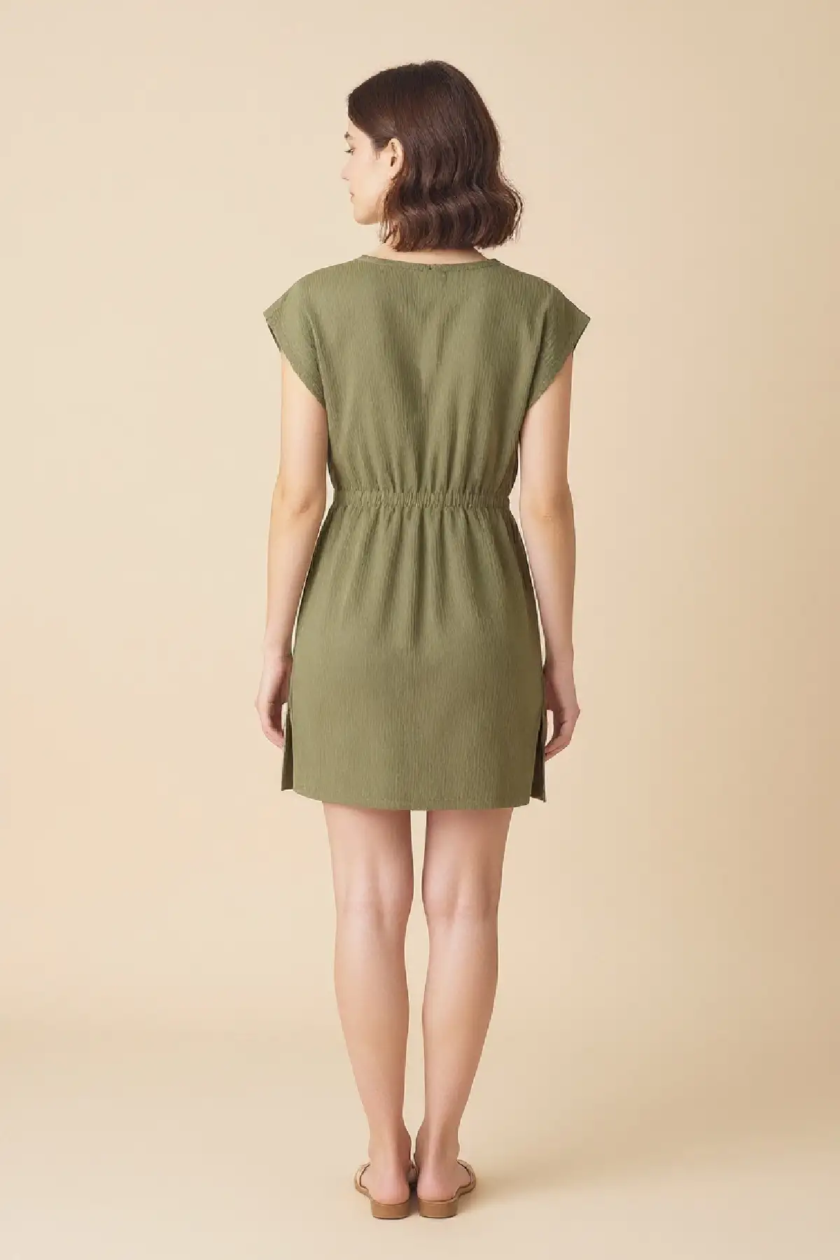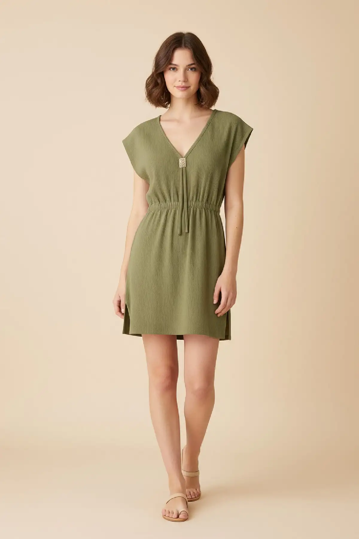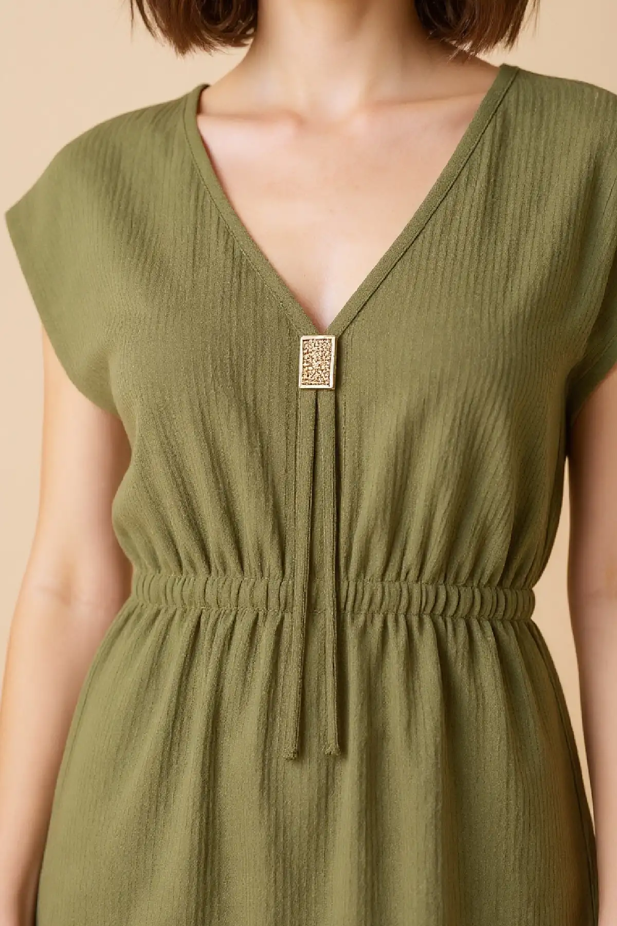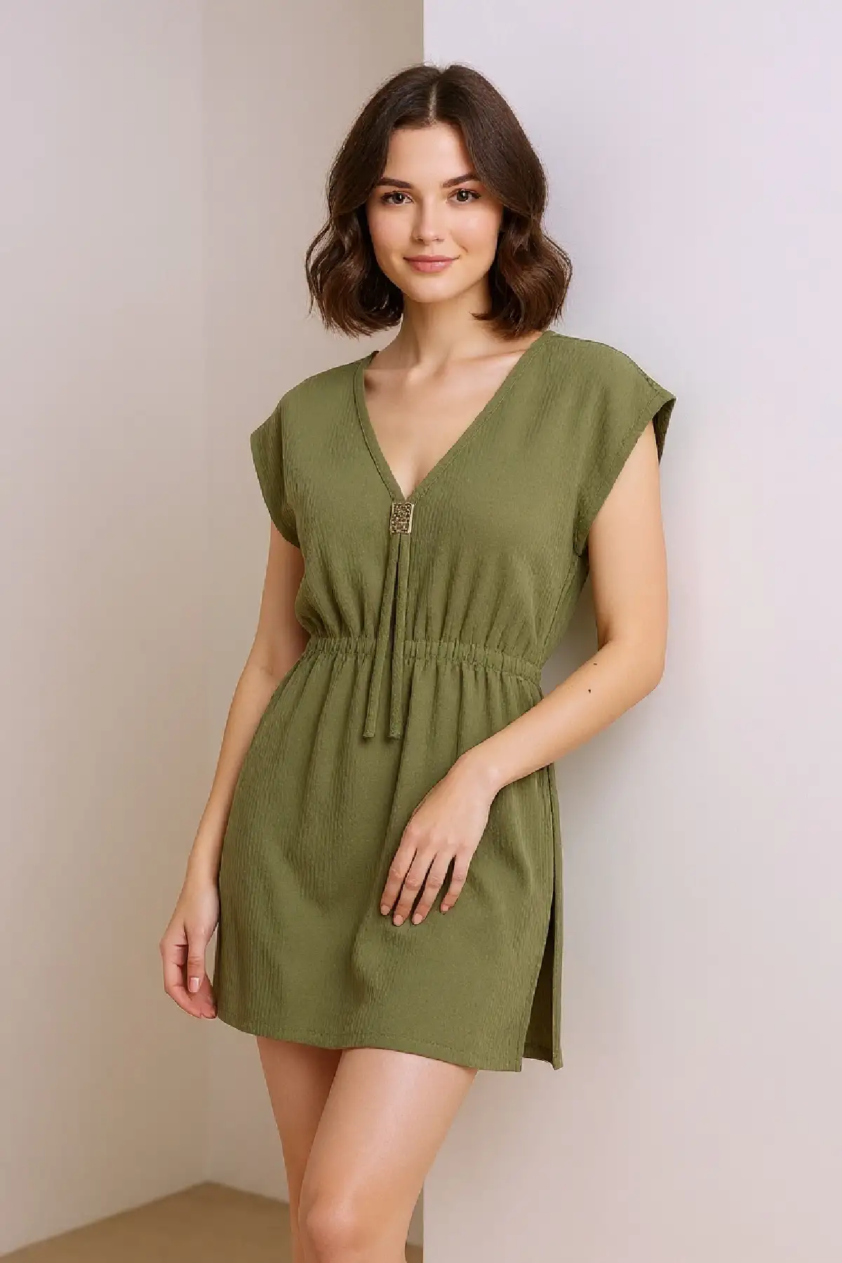Kadın Haki Yanları Yırtmaçlı Tokalı V Yaka Mini Plaj Elbisesi, doğanın huzur veren tonlarını modern bir tasarımla buluşturuyor.Hafif ve akışkan kumaşı sayesinde yaz sıcağında serin tutarken, bel kısmındaki tokalı detayı ile zarif bir form kazandırır.Yan yırtmaçları hareket kolaylığı sağlarken, V yaka detayı boyun hattını ön plana çıkarır.Minimal aksesuarlarla kolayca tamamlanabilen bu model, hem plaj kombinlerinde hem günlük şehir stilinde mükemmel bir uyum sağlar.Haki tonunun doğallığıyla yazın enerjisini yansıtan bu elbise, her vücut tipine uyum sağlayan rahat kesimiyle dolabınızın favorisi olacak.Öne çıkan özellikler:Tokalı V yaka tasarımYan yırtmaç detaylı modern kesimHafif, dökümlü kumaş yapısıPlaj, tatil ve günlük kombinlerde kullanım kolaylığıDoğal ve sade renk geçişleriyle modern görünüm]]>