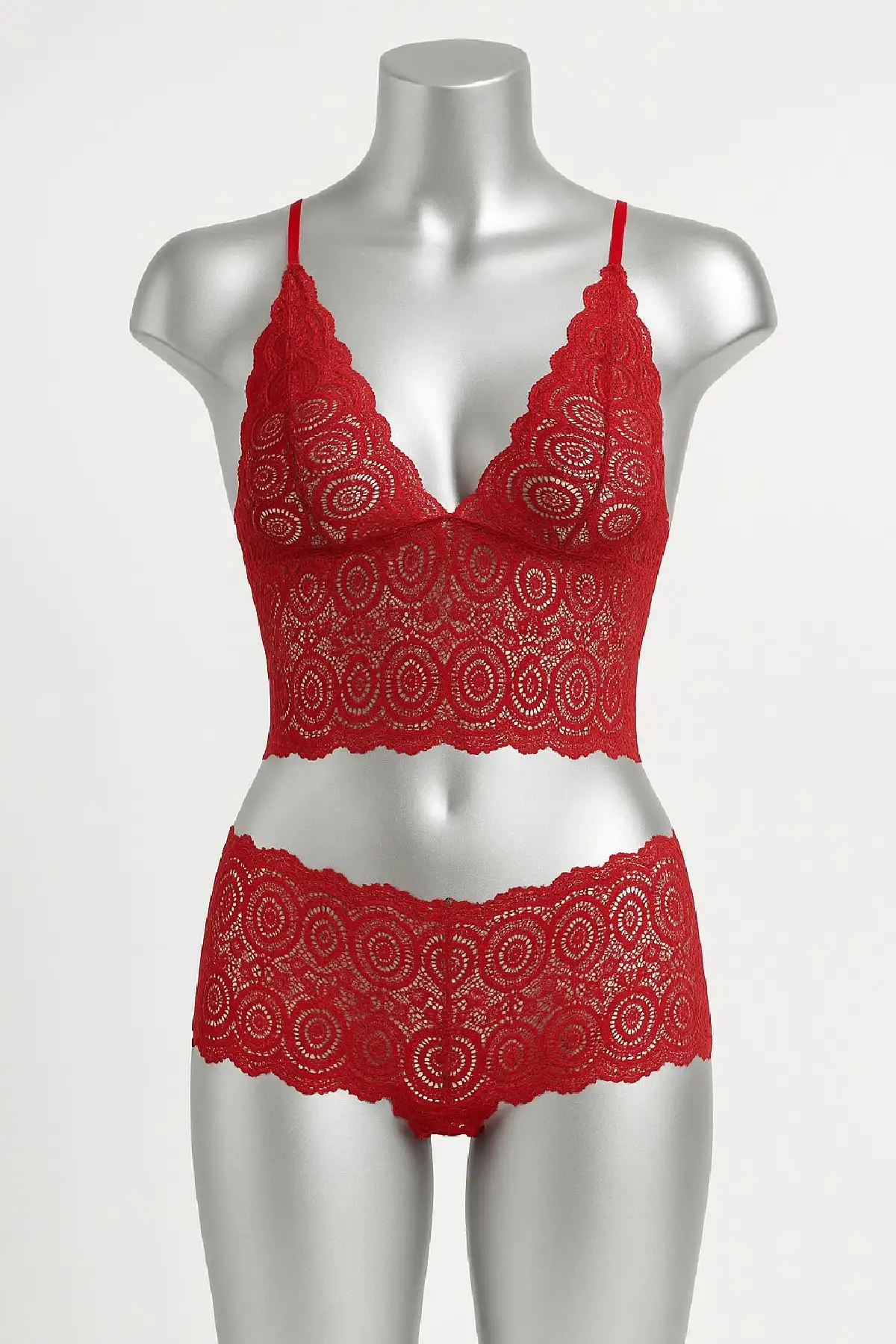 Tutkunun simgesi olan kırmızı dantel bralet şort takımı, cesur ve feminen bir görünüm isteyenler için özel olarak tasarlandı.