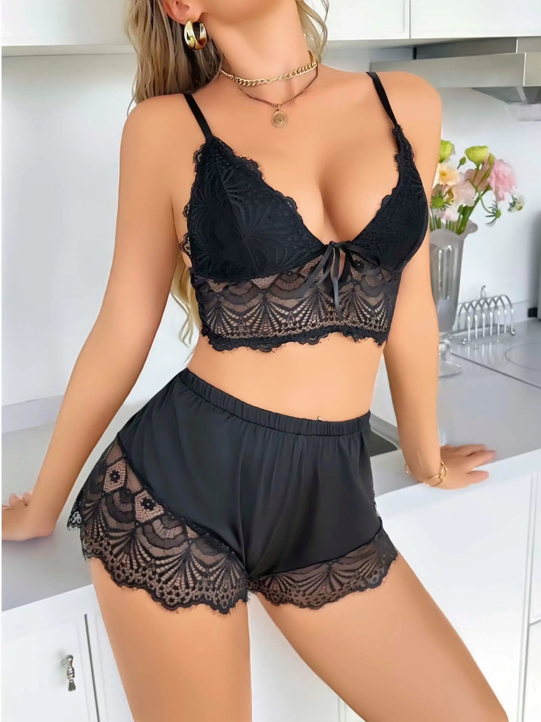 Kadın Siyah Dantel Detaylı şortlu gecelik pijama takımı, cesur ve şık bir görünüm yaratır. Yumuşak kumaşı sayesinde rahat kullanım imkanı sunar.
