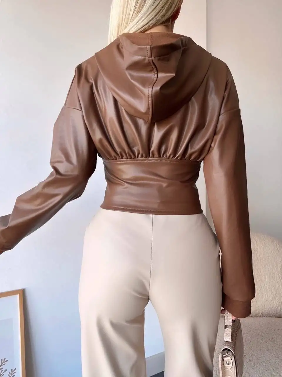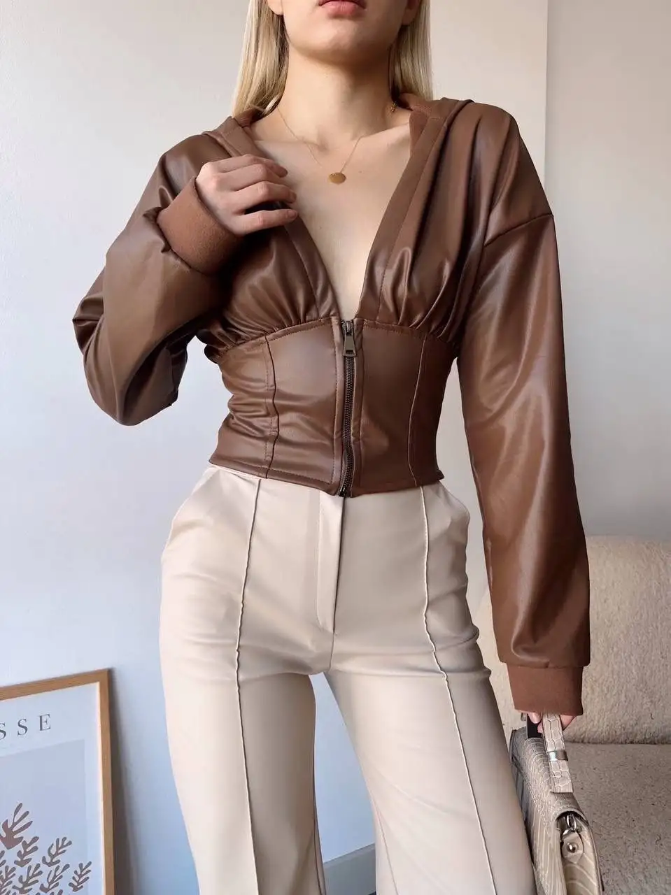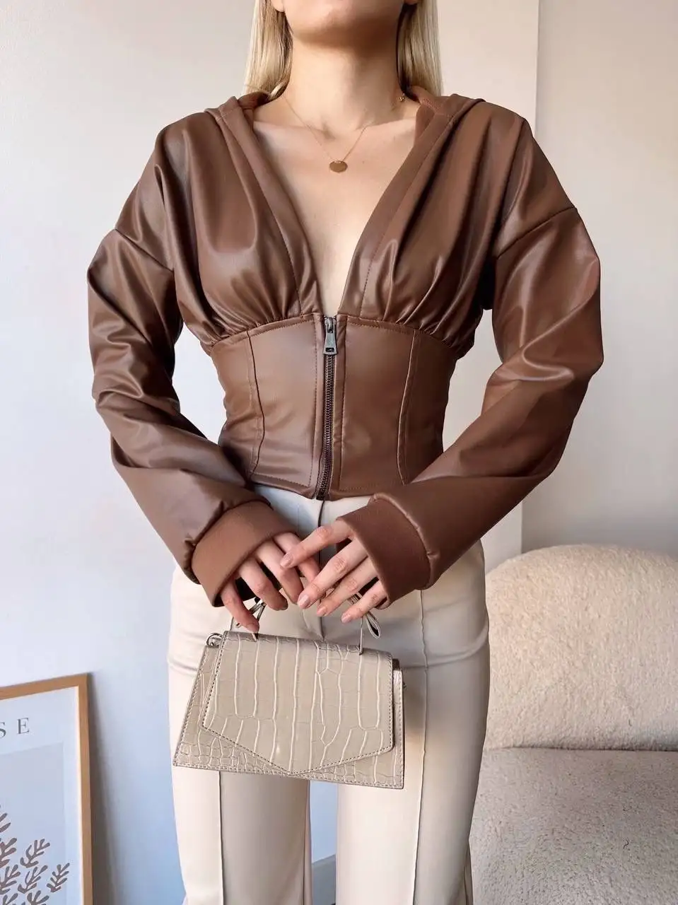 Kapşonlu yarım fermuarlı ceket kahve h24116