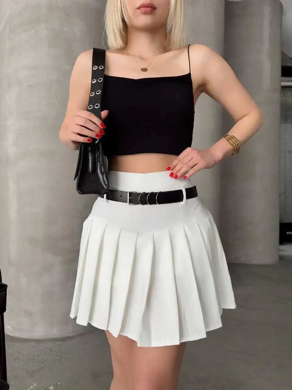 Yaza özel şıklık ve rahatlık sunan kemerli piliseli şort etek beyaz s25305, gardırobunuzun favori parçalarından olmaya aday.