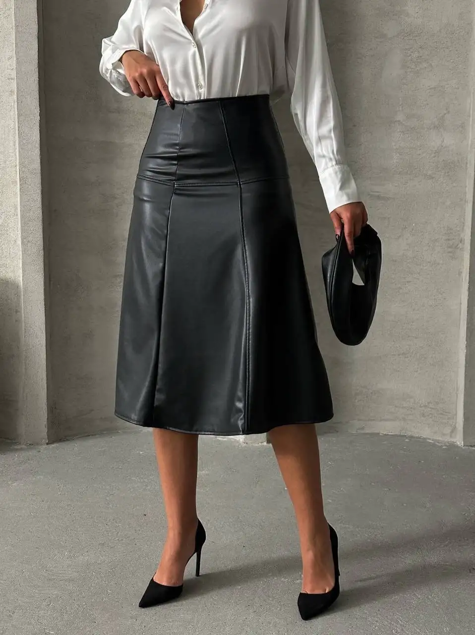 Şıklığı ön planda tutan Komple parçalı deri eteği, gece davetlerinden günlük şıklığa kadar birçok farklı kombinle kullanabilirsiniz.