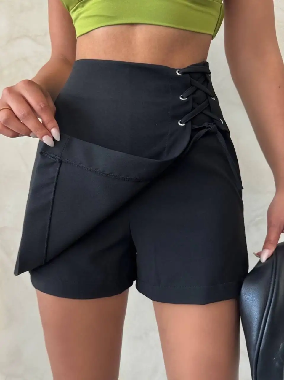 Çıtçıtlı siyah köprü tüvit şort yeşil