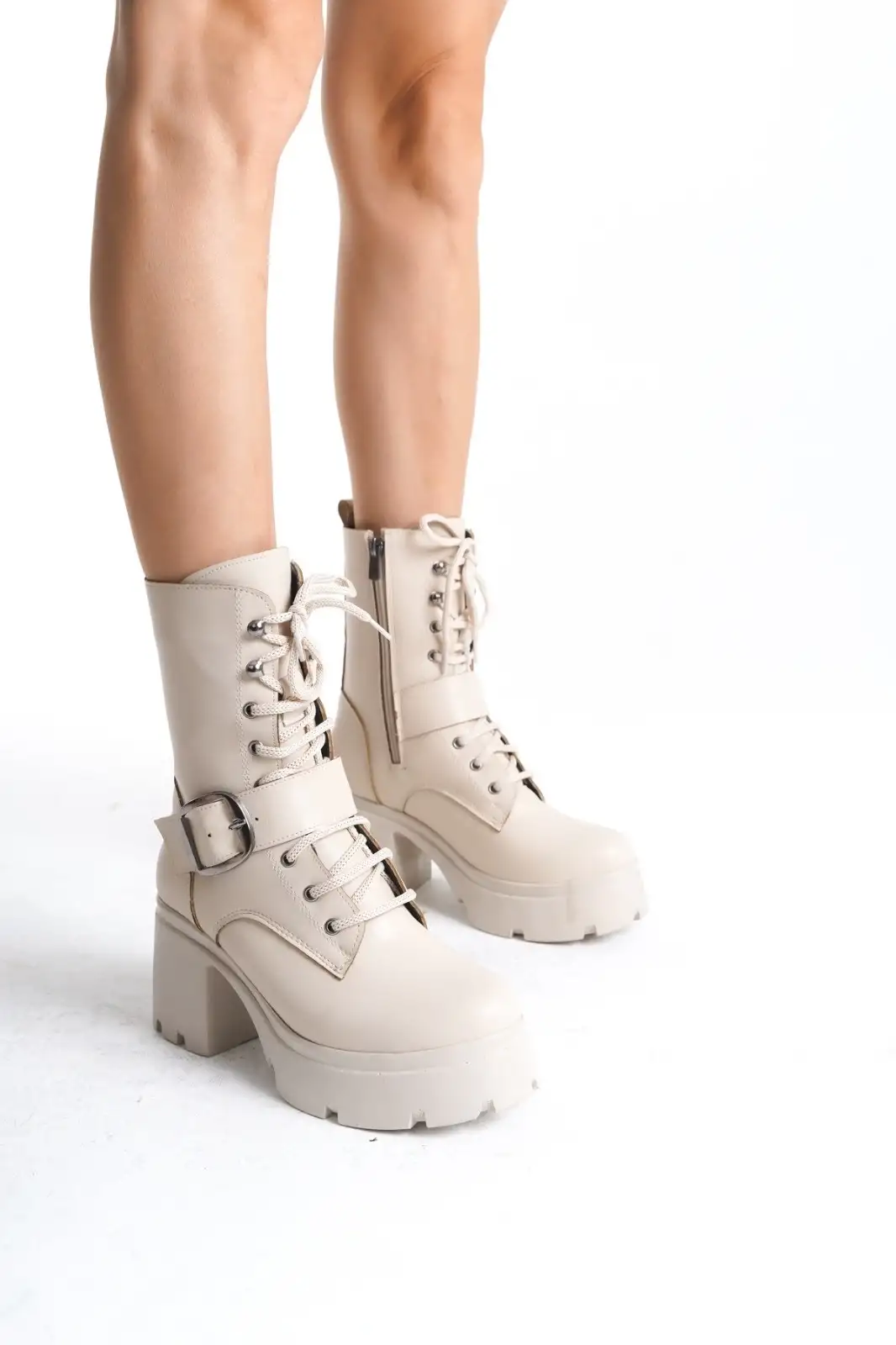 Linma Bej Cilt Bağcıklı Topuklu Bot