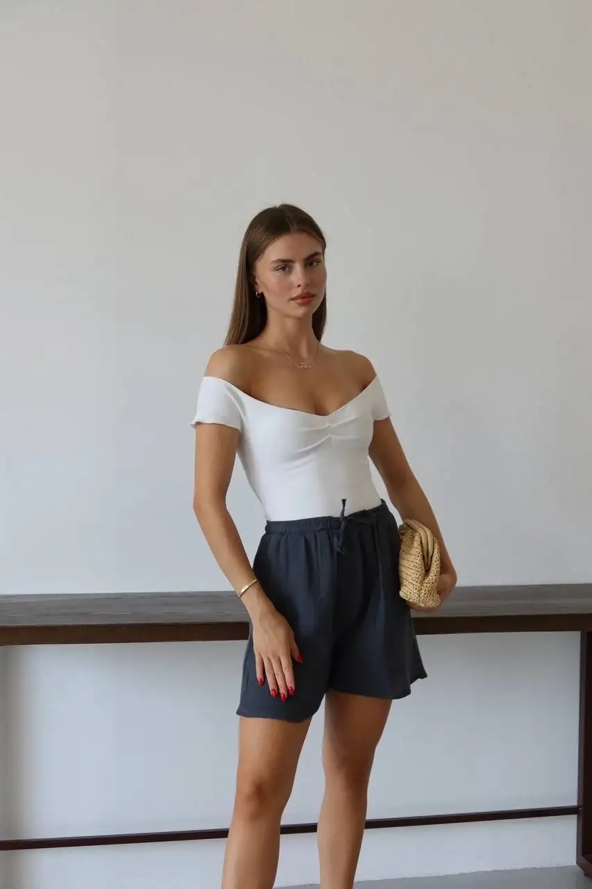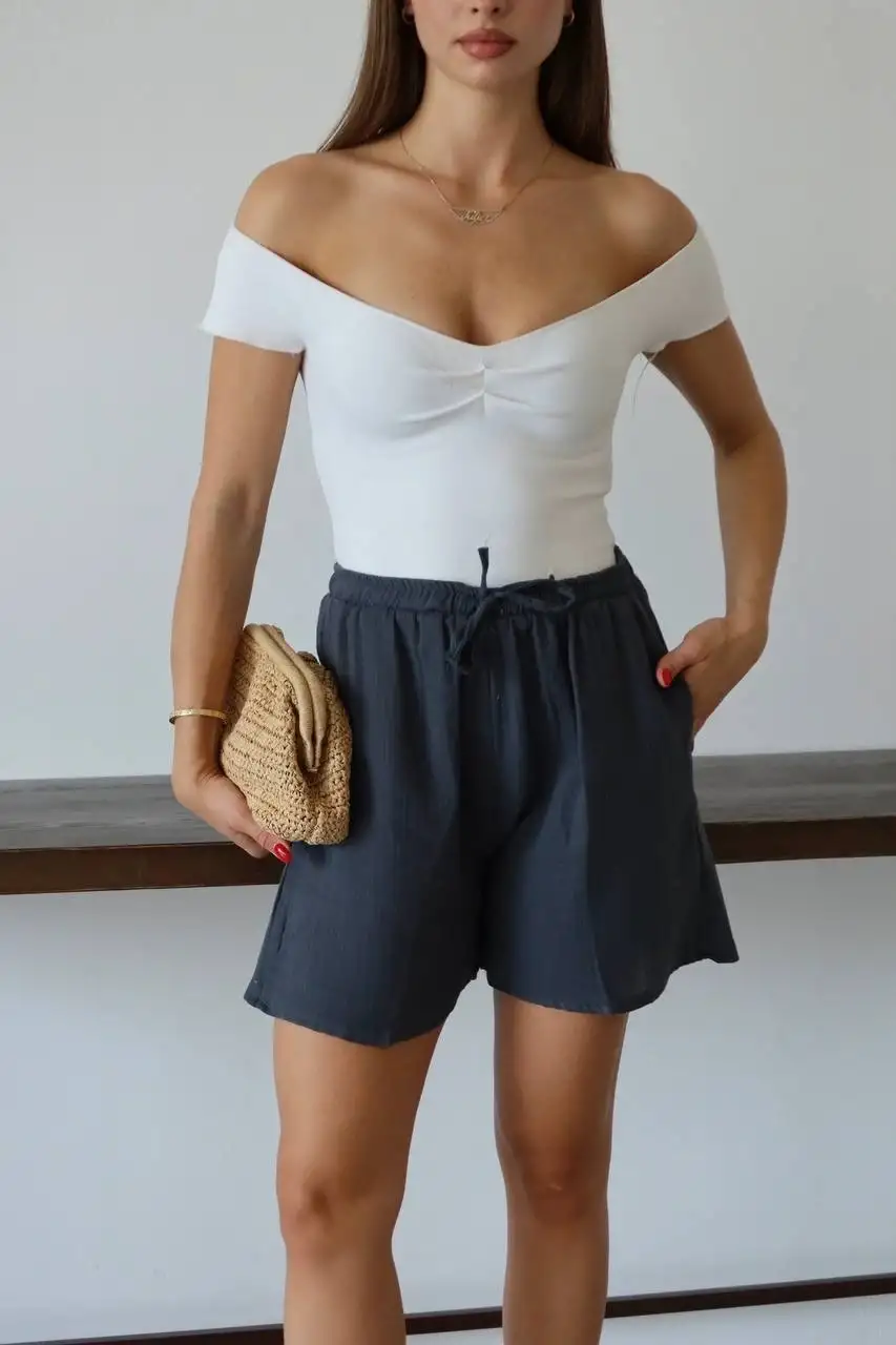 Yaz aylarının vazgeçilmezi şortların şıklıkla buluştuğu Müsli kumaş şort bağcıklı antrasit pt, gardırobunuzun favori parçası olmaya aday!