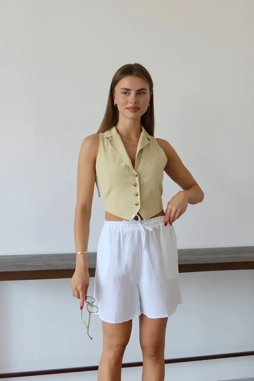 Kadınların yaz aylarında rahatlıkla tercih edebileceği şık ve şort modeli: Müslin kumaş şort bağcıklı beyaz PT!
