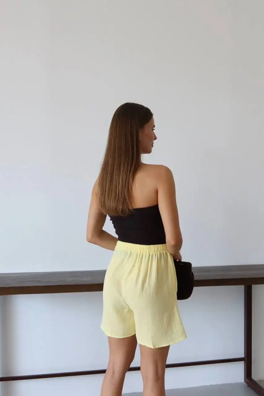 Müslin Kumaş Şort Bağcıklı Sarı PT hem şıklığı hem de rahatlığı bir arada sunuyor. Müslin kumaştan üretilmiş olan bu şort, yaz aylarında serin ve konforlu bir deneyim sunar.