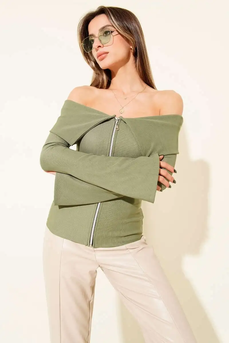 Omzu Açık Fermuarlı Bluz haki T4330, feminen ve şık bir görünüm arayan kadınlar için ideal bir seçenektir.
