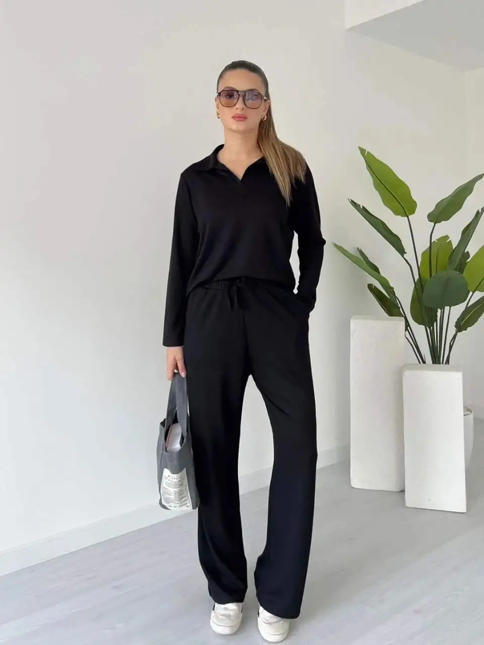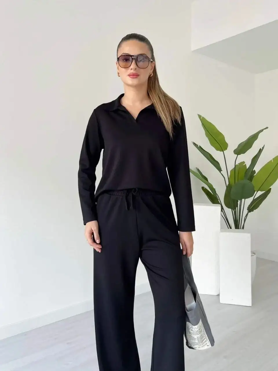 Polo yaka alt üst kollu modal takım siyah pt