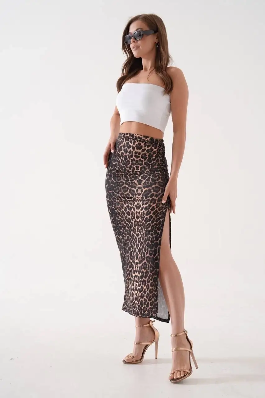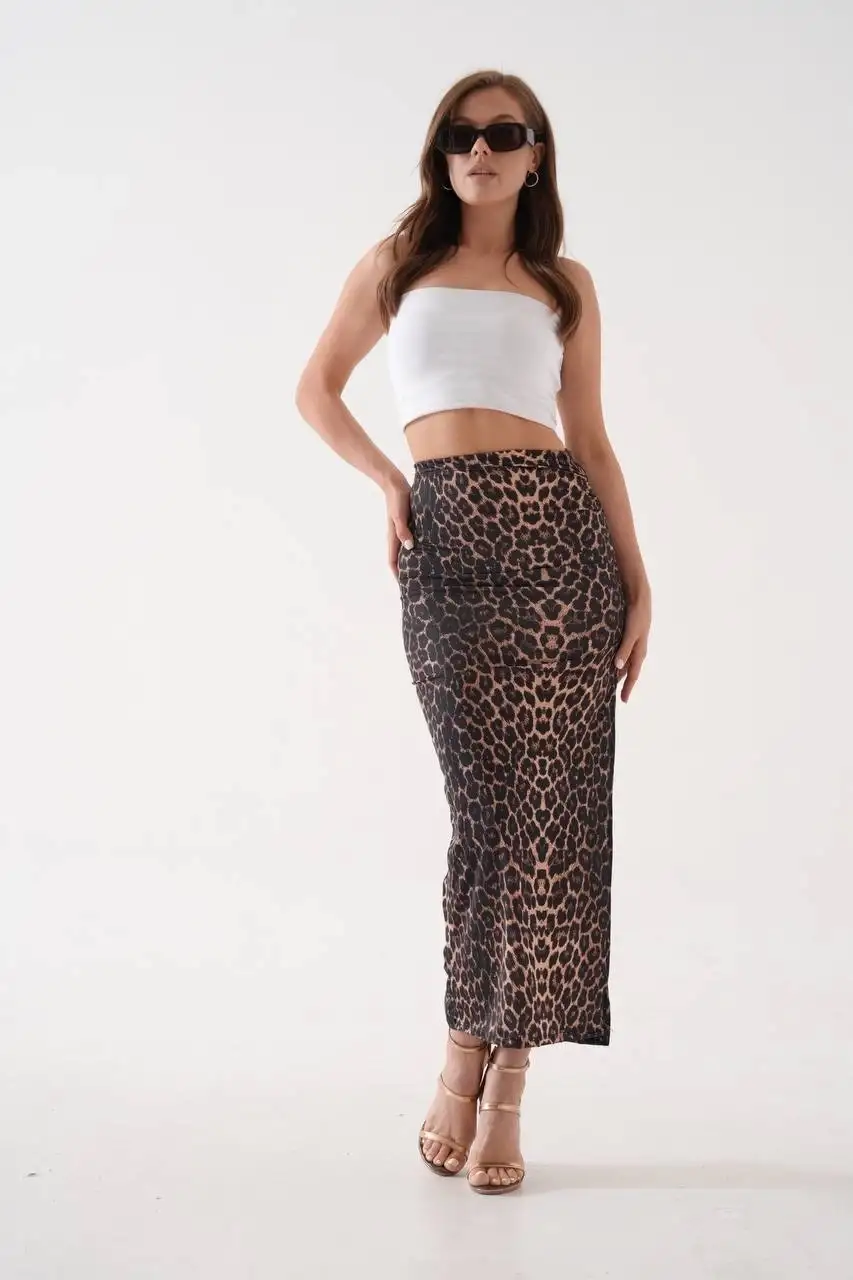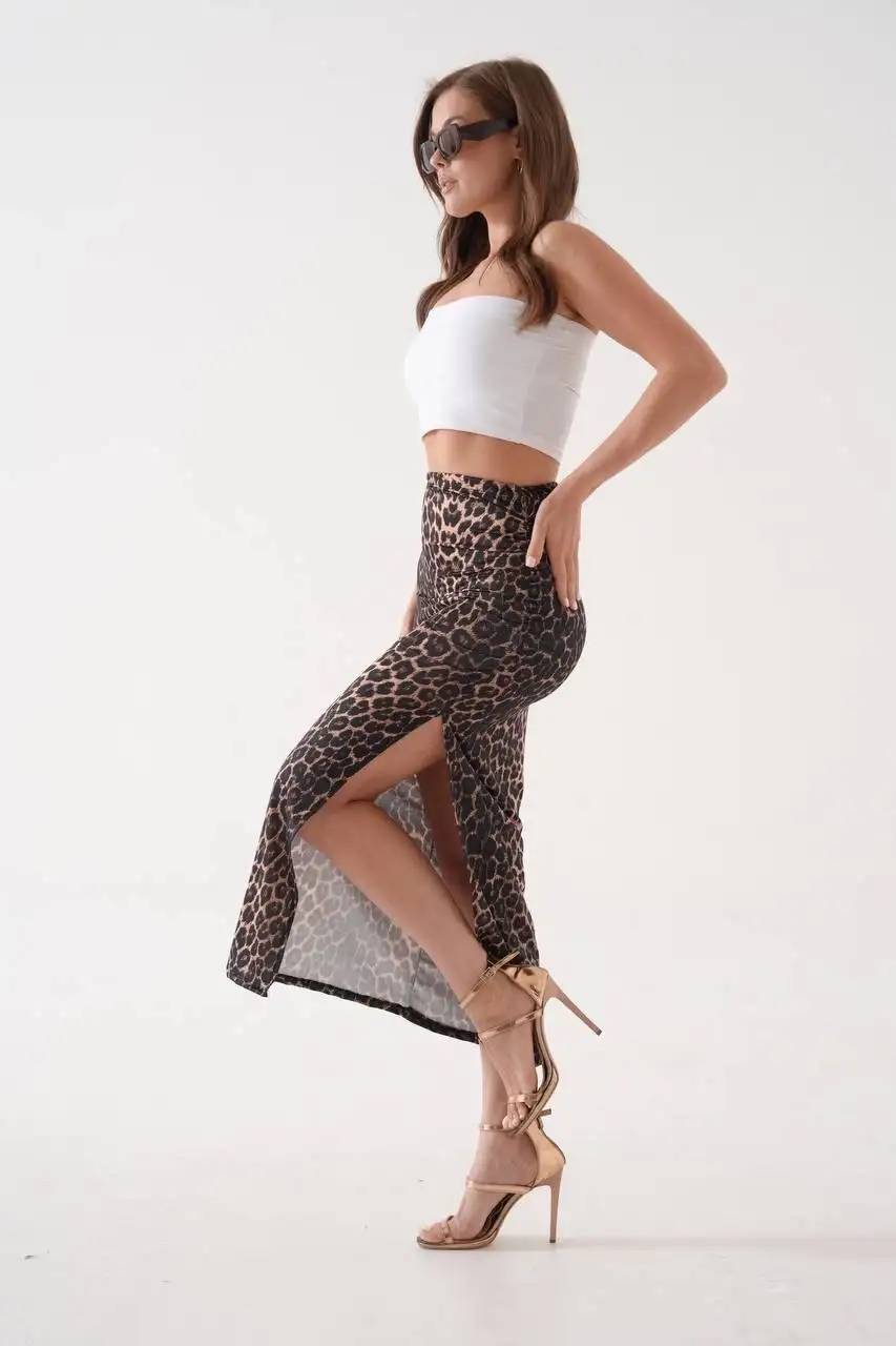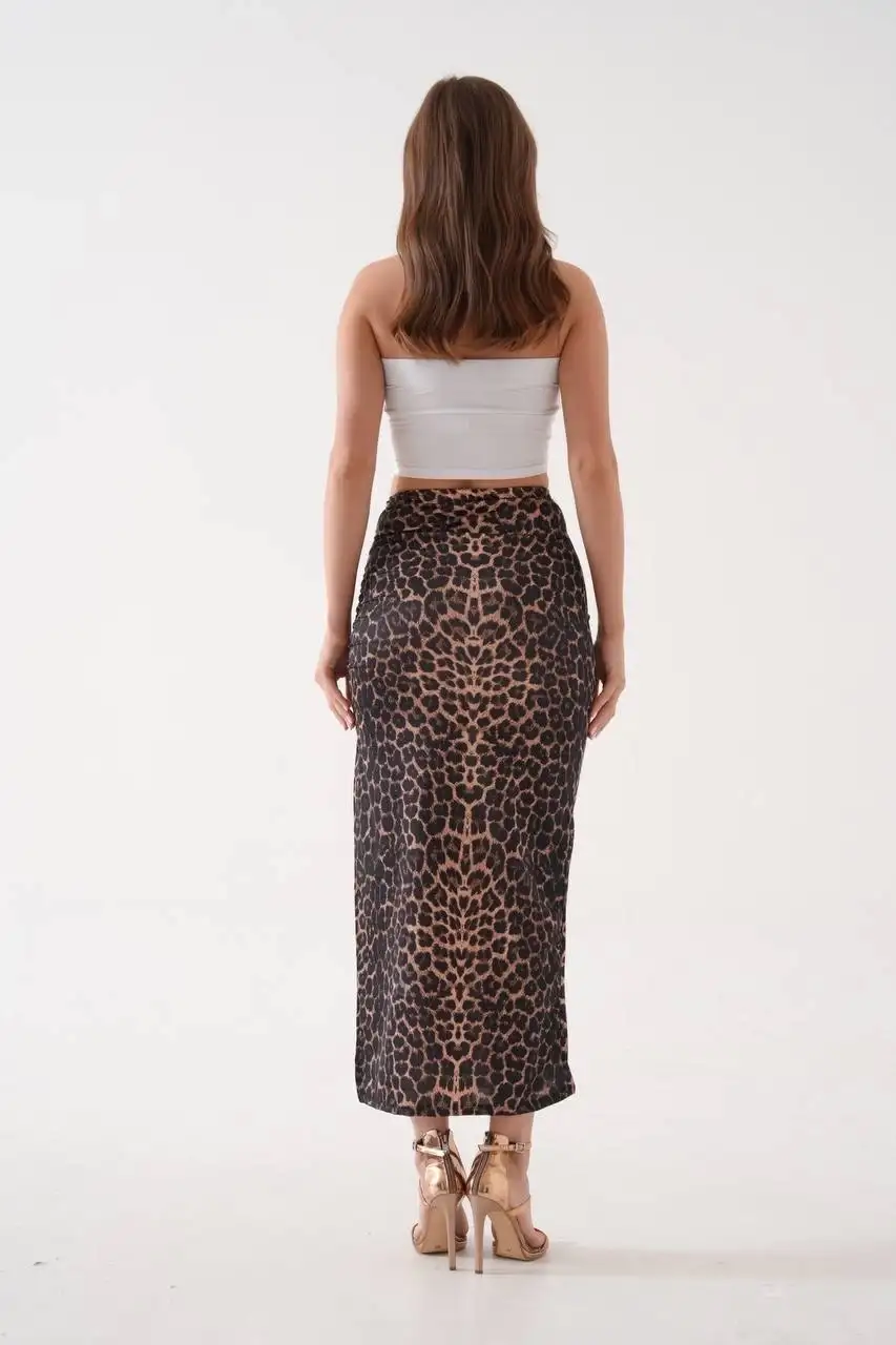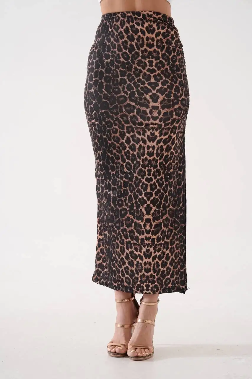 Uzun yırtmaçlı ince kumaş etek, şıklığı ve modernliği bir araya getiriyor. Leopar desenli tasarımıyla dikkat çeken bu etek, iddialı ve trend bir görünüm sunuyor.