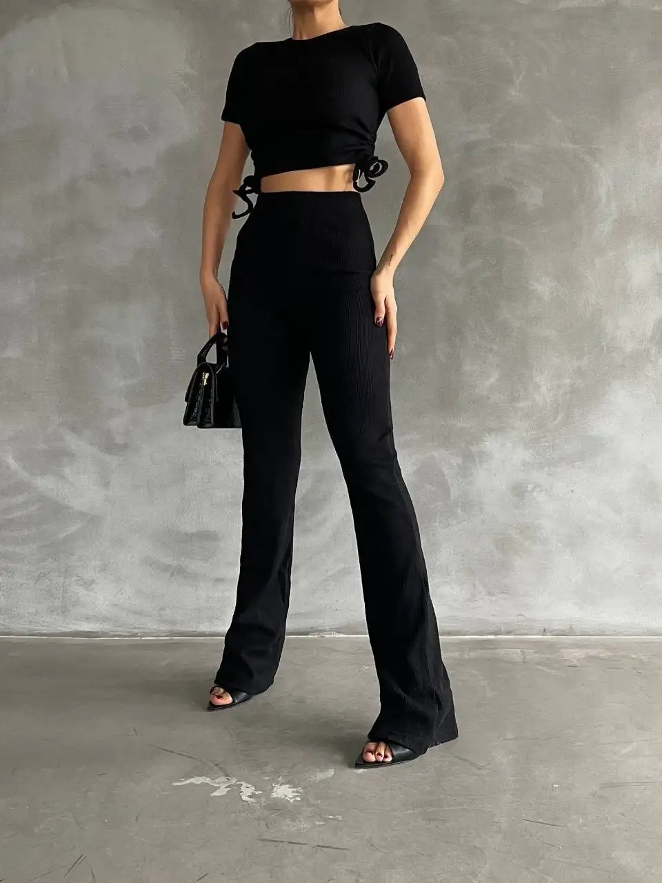 • Yanları tünel detaylı pantolonu, uyumlu bluzu ile kombin tamamlar.