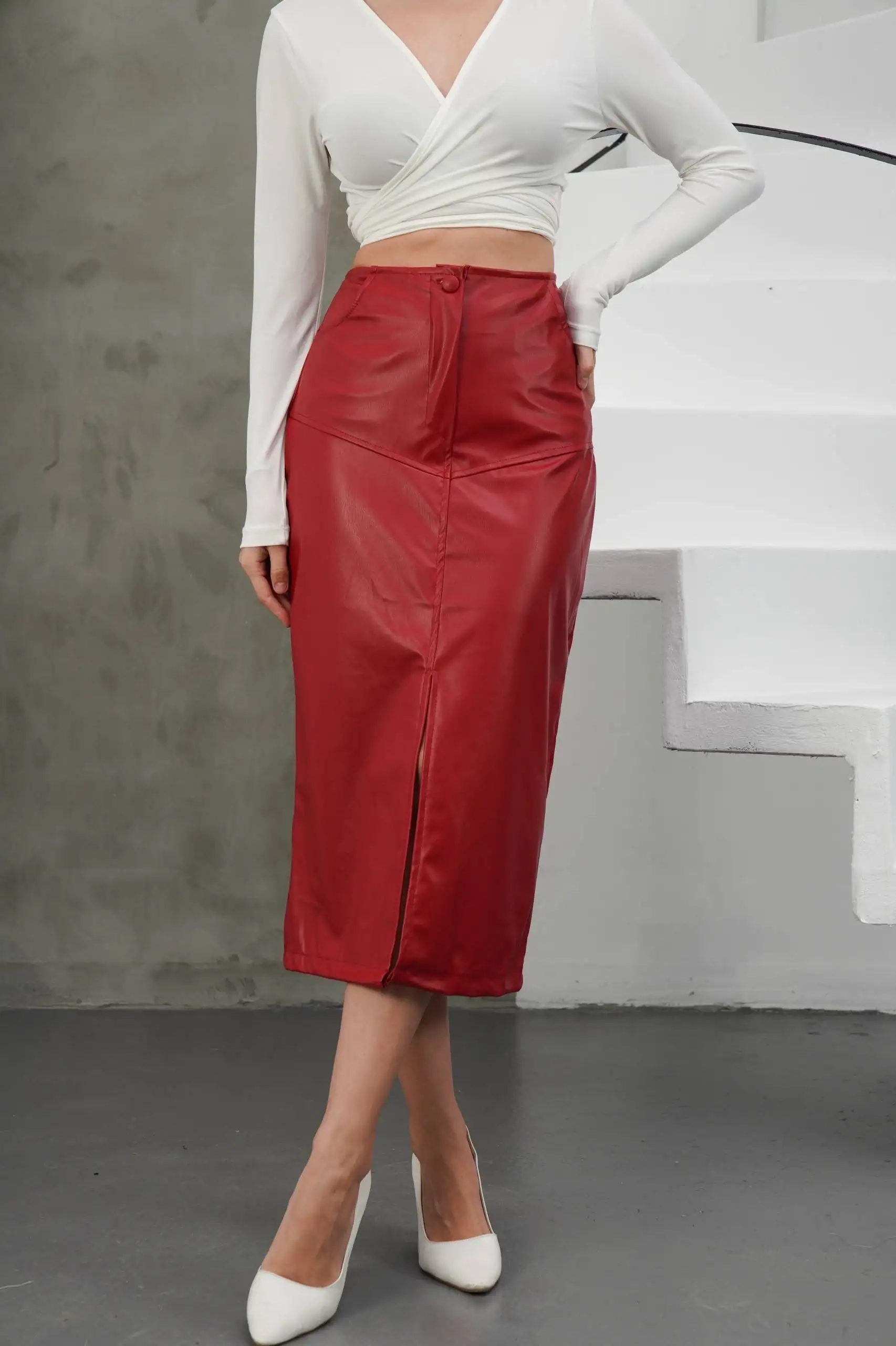 Bordo rengiyle dikkat çeken yırtmaç detayı, modern ve şık bir görünüm elde etmenizi sağlar. Tüm bedenlere uygun olan bu deri eteği, topuklu ayakkabılarla şık bir kombin oluşturabilirsiniz.